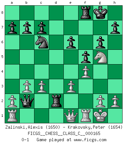 Last move : 0-1 2011 March 24 16:49:21 [Event "FICGS__CHESS__CLASS_C__000165"] [Site "FICGS"] [Date "2010.12.22"] [Round "1"] [White "Zalinski,Alexis"] [Black "Krakovsky,Peter"] [Result "0-1"] [WhiteElo "1650"] [BlackElo "1654"] 1.f4 d5 2.Nf3 Nf6 3.e3 g6 4.b3 Bg7 5.Bb2 O-O 6.Nc3 Bf5 7.Bd3 Ne4 8.Na4 Bxb2 9.Nxb2 Nc6 10.O-O Bg4 11.Be2 Qd6 12.Qe1 Rad8 13.c3 Qa3 14.Nd3 e6 15.Nf2 Bxf3 16.Bxf3 Qb2 17.Bxe4 dxe4 18.Nxe4 f5 19.Ng5 Rxd2 0-1 Bird's Opening Kingside Castling by player Black (move 5) Kingside Castling by player White (move 10) Player Black won this chess game. Follow this game move after move (download)Live, lose, and learn, by observing your opponent how to win. (Amber Steenbock) Ein guter Spieler hat immer Glück. (José Raúl Capablanca) La táctica fluye a partir de una posición superior. (Bobby Fischer) Je crois qu'il existe des manières très spécifiques de jouer efficacement contre une machine. Evidemment, nous n'avons aucune chance en technique pure, parce que l'ordinateur calcule de manière parfaite. Mais lorsque nous faisons appel à notre cerveau, en utilisant l'intuition et la compréhension, alors nous restons beaucoup plus forts. (Anatoli Karpov) God is an atheist. (Unknown)