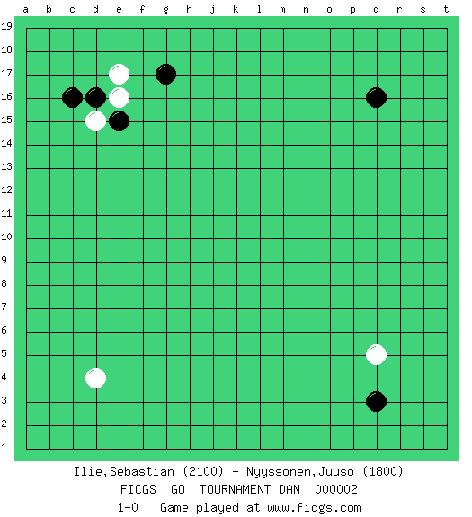 Last move : 1-0 2007 January 12 5:45:51 [Event "FICGS__GO__TOURNAMENT_DAN__000002 "] [Site "FICGS"] [Date "2006.12.04"] [Round "1"] [Black "Ilie,Sebastian "] [White "Nyyssonen,Juuso "] [Result "1-0"] [Rating 1 "2100"] [Rating 2 "1800"] 1.q16 d4 2.q3 q5 3.c16 e17 4.g17 d15 5.d16 e16 6.e15 1-0 This go game has been lost on time (started : 2006.12.04 22:28:52) Here are the names of the openings (joseki) played in the four corners : Corner q4 : q3 q5Komoku (Somok, Xiao~mu`) 3-4 Point. The komoku (3-4) point is the traditional corner enclosure move..Ikken Takagakari (Hankan Nop'dakeolch'im, Yi Gaogua`jiao~, 1-Space High Approach). The 5-4 approach move has become more popular in modern times, as modern Go emphasizes speed and influence. Corner d16 : c16 e17Komoku (Somok, Xiao~mu`) 3-4 Point. The komoku (3-4) point is the traditional corner enclosure move..Ikken Kakari (Hankan Keolch'im, Yi Gua`jiao~, 1-Space Low Pincer). The small knight move is the basic approach move to the 3-4 point stone. It has been continually used for over four centuries. There are limitless variations, with new moves constantly being discovered. White 2 opens the door to a treaure store of joseki. Player Black won this Go (weiqi, baduk) game.Follow this game move after move (download ) There is damezumari at the bamboo joint. (Anonymous) It's only after you lost everything, Tyler says, that you're free to do anything. (Chuck Palahniuk, Fight Club)