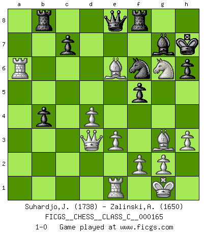 Last move : 1-0 2011 March 26 10:12:46 [Event "FICGS__CHESS__CLASS_C__000165"] [Site "FICGS"] [Date "2010.12.22"] [Round "1"] [White "Suhardjo,Johanes"] [Black "Zalinski,Alexis"] [Result "1-0"] [WhiteElo "1738"] [BlackElo "1650"] 1.d4 f5 2.Nf3 Nf6 3.h3 g6 4.Nc3 Bg7 5.Bf4 O-O 6.e3 d6 7.Bd3 Qe8 8.O-O a6 9.a4 Nc6 10.Bc4+ Kh8 11.Bg3 Bd7 12.Ng5 e6 13.Be2 Rc8 14.Re1 e5 15.Bc4 Na5 16.Ba2 h6 17.Nf3 e4 18.Nd2 Bxa4 19.b4 Nc6 20.Nxa4 Nxb4 21.Bb3 d5 22.Nc5 Qc6 23.c3 Nd3 24.Nxd3 exd3 25.c4 dxc4 26.Nxc4 b5 27.Ne5 Qe8 28.Rxa6 Kh7 29.Qxd3 b4 30.Be6 Rb8 31.Nxg6 1-0 Dutch Kingside Castling by player Black (move 5) Kingside Castling by player White (move 8) Player White won this chess game. Follow this game move after move (download)It's always better to sacrifice your opponent's men. (Savielly Tartakover) Wer wird heute Abend ihr Gegner sein? -- Heute Abend spiele ich gegen die schwarzen Steine. (Akiba Rubinstein) a manera como él juega al Ajedrez, demuestra la completa naturaleza de un hombre. (Stanley Ellin) Des combinaisons [dans le jeu d'échecs] pareilles à des mélodies. Je crois entendre pour ainsi dire la musique des coups... (Vladimir Nabokov) Gambling : The sure way of getting nothing from something. (Wilson Mizner)