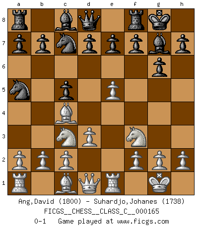 Last move : 0-1 2011 January 3 10:51:32 [Event "FICGS__CHESS__CLASS_C__000165"] [Site "FICGS"] [Date "2010.12.22"] [Round "1"] [White "Ang,David"] [Black "Suhardjo,Johanes"] [Result "0-1"] [WhiteElo "1800"] [BlackElo "1738"] 1.e4 c5 2.Nf3 Nc6 3.Bb5 g6 4.O-O Bg7 5.Re1 Nf6 6.e5 Nd5 7.Nc3 Nc7 8.Bc4 O-O 9.d3 Na5 0-1 Sicilian : Nimzovich-Rossolimo attack (with ...g6, without ...d6) Kingside Castling by player White (move 4) Kingside Castling by player Black (move 8) Player Black won this chess game. Follow this game move after move (download)You are for me the Queen on d8 and I am the Pawn on d7 !! (Eduard Gufeld) Ein Teil des Fehlers ist immer korrekt. (Savielly Grigorievitsch Tartakower) Dejen al perfeccionista jugar por correo. (Yasser Seirawan) Fischer est le meilleur joueur du monde et Karpov n'est qu'un joueur de bistrot. (Garry Kasparov, agé de 16 ans) A good book on your shelf is a friend that turns its back on you and remains a friend. (Author unknown)