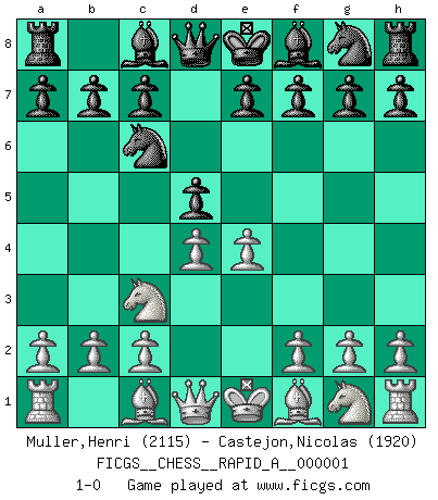 Last move : 1-0 2006 June 2 9:15:15 [Event "FICGS__CHESS__RAPID_A__000001"] [Site "FICGS"] [Date "2006.04.30"] [Round "1"] [White "Muller,Henri"] [Black "Castejon,Nicolas"] [Result "1-0"] [WhiteElo "2115"] [BlackElo "1920"] 1.e4 Nc6 2.d4 d5 3.Nc3 1-0 This chess game has been lost on time (started : 2006.04.30 20:27:54) KP : Nimzovich defense, Bogolyubov variation Player White won this chess game. Follow this game move after move (download)Checkers is for tramps. (Paul Morphy) Weshalb minderdergeübte Spieler mit g2-g4 beginnen? Die betreffenden sind unschlüssig, ob sie nun rechts (h4) oder links (f4) beginnen sollen, und in ihrer Ratlosigkeit entschliessen sie sich nach guter Bürgerart dazu, den goldenen Mittelweg zu wählen. (Aaron Nimzowitsch) Peones: ellos son el alma de esta partida, solos forman el ataque y la defensa. (Philidor) Un footballeur joue avec ses pieds, parfois avec sa tête. Un joueur d'échecs ne joue qu'avec sa tête. Et quand il ne joue plus, il meurt. (Jacob Murray) Excelling at chess has long been considered a symbol of more general intelligence. That is an incorrect assumption in my view, as pleasant as it might be. But for the purposes of argument and investigation, chess is, in Russkin-Gutman's words, 'an unparalleled laboratory, since both the learning process and the degree of ability obtained can be objectified and quantified, providing an excellent comparative framework on which to use rigorous analytical techniques.' (The Chess Master and the Computer, by Garry Kasparov - 2010)