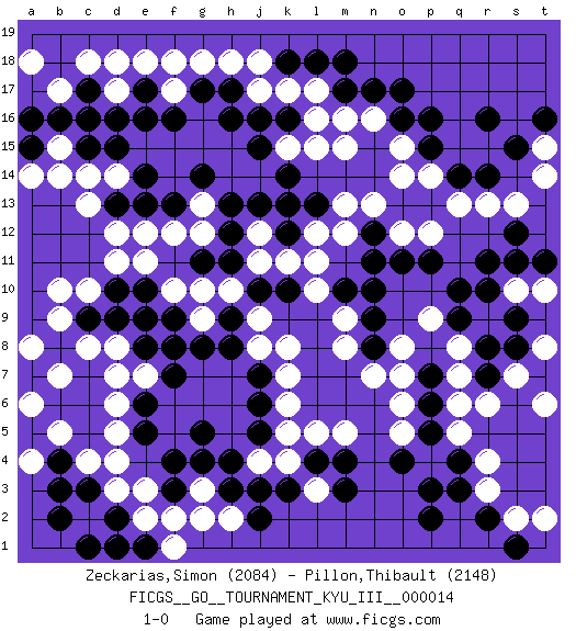 Last move : 1-0 2011 January 7 21:35:4 [Event "FICGS__GO__TOURNAMENT_KYU_III__000014"] [Site "FICGS"] [Date "2010.12.22"] [Round "1"] [Black "Zeckarias,Simon"] [White "Pillon,Thibault"] [Result "1-0"] [Rating 1 "2084"] [Rating 2 "2148"] 1.r16 d17 2.q3 d3 3.d15 d12 4.e17 e18 5.e16 f18 6.c17 c18 7.d16 d18 8.h16 b17 9.d9 f12 10.c5 q5 11.o4 r3 12.r2 r4 13.p2 r9 14.f4 e3 15.e5 g3 16.o17 j17 17.g17 g18 18.j16 k17 19.h12 g10 20.e13 e12 21.j10 c14 22.b16 c10 23.c9 b15 24.a16 c16 25.c15 b14 26.c17 r13 27.c16 b9 28.b8 b10 29.r11 p12 30.p11 o12 31.r7 q7 32.r8 q8 33.s9 r6 34.q9 o15 35.p16 m15 36.j3 l3 37.j5 l5 38.b3 h2 39.j2 c2 40.b2 e2 41.p6 s7 42.s8 q6 43.o11 p9 44.q10 o5 45.p5 p4 46.q4 o6 47.p3 o8 48.p7 o7 49.m4 m5 50.l4 k4 51.m3 k5 52.k3 s2 53.s1 t2 54.p15 p14 55.l18 l17 56.m18 j11 57.h11 h10 58.k10 j12 59.j13 l11 60.k13 l12 61.l13 m13 62.f13 j8 63.n10 m9 64.h3 g2 65.j6 k6 66.j7 k7 67.h8 j9 68.n12 n13 69.n9 m8 70.c7 f8 71.h17 h18 72.k18 j18 73.q14 q13 74.r14 k15 75.j15 d14 76.e14 s13 77.s15 t6 78.s12 g13 79.h13 g12 80.g14 d6 81.g5 d5 82.c6 c4 83.b4 a18 84.k16 l16 85.k14 l15 86.d10 f17 87.f16 d11 88.d13 c13 89.a15 a14 90.f9 f10 91.g8 e9 92.f7 g9 93.e6 n16 94.n17 d7 95.e8 d8 96.f9 s10 97.r10 f8 98.c3 d4 99.f9 c8 100.e10 a6 101.b6 a8 102.a5 b7 103.a7 t10 104.t11 a6 105.c1 d1 106.a7 t8 107.s11 a6 108.d2 b5 109.e1 f1 110.d1 e11 111.e9 e7 112.f8 a4 113.h9 k8 114.m10 l10 115.n8 n7 116.o16 o14 117.f3 f2 118.g4 j4 119.h4 t14 120.m17 m12 121.n11 t15 122.t16 m16 123.k12 k11 124.g11 1-0 Here are the names of the openings (joseki) played in the four corners : Corner d16 : d17 d15 Komoku (Somok, Xiao~mu`) 3-4 Point. The komoku (3-4) point is the traditional corner enclosure move.. Ikken Takagakari (Hankan Nop'dakeolch'im, Yi Gaogua`jiao~, 1-Space High Approach). The 5-4 approach move has become more popular in modern times, as modern Go emphasizes speed and influence. Corner d4 : d3 d9 Komoku (Somok, Xiao~mu`) 3-4 Point. The komoku (3-4) point is the traditional corner enclosure move.. Corner q4 : q3 q5 Komoku (Somok, Xiao~mu`) 3-4 Point. The komoku (3-4) point is the traditional corner enclosure move.. Ikken Takagakari (Hankan Nop'dakeolch'im, Yi Gaogua`jiao~, 1-Space High Approach). The 5-4 approach move has become more popular in modern times, as modern Go emphasizes speed and influence. Player Black won this Go (weiqi, baduk) game. Follow this game move after move (download)The weak player fears ko, the strong player seeks it. (Bill Taylor) Macintosh - we might not get everything right, but at least we knew the century was going to end. (Douglas Adams)
