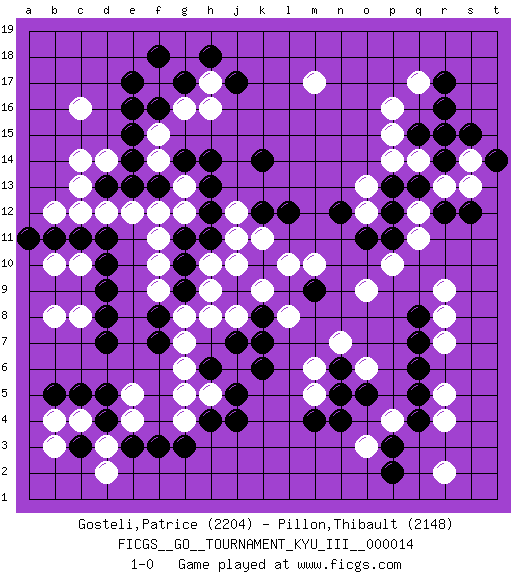 Last move : 1-0 2011 January 7 23:7:43 [Event "FICGS__GO__TOURNAMENT_KYU_III__000014"] [Site "FICGS"] [Date "2010.12.22"] [Round "1"] [Black "Gosteli,Patrice"] [White "Pillon,Thibault"] [Result "1-0"] [Rating 1 "2204"] [Rating 2 "2148"] 1.r17 e5 2.p3 f17 3.d11 c16 4.e3 d3 5.d4 e4 6.c3 d2 7.f3 c4 8.d5 b3 9.c5 b4 10.d7 g5 11.h4 g4 12.g3 h5 13.j4 f9 14.f8 h8 15.g9 g8 16.f7 f10 17.j9 j8 18.j5 j6 19.k6 k9 20.g10 f11 21.h6 g6 22.j7 g7 23.k8 j10 24.h11 j11 25.h12 g12 26.h13 h9 27.d9 f14 28.l12 l8 29.k7 m10 30.n12 r4 31.q5 r5 32.q6 r7 33.q7 r8 34.q8 h10 35.g11 r9 36.m9 l10 37.e15 g13 38.k12 k11 39.e17 f15 40.f16 g16 41.e16 c14 42.d13 c13 43.g17 h16 44.h14 j12 45.k14 d14 46.e14 d12 47.e13 e12 48.f13 f12 49.g14 h17 50.f18 b8 51.c11 c12 52.b5 c8 53.d8 b10 54.b11 c10 55.d10 b12 56.a11 m17 57.h18 p16 58.j17 q17 59.r16 q14 60.r14 o3 61.p2 p4 62.q4 o6 63.n4 o9 64.n6 n7 65.o5 m6 66.n5 m5 67.m4 r13 68.q15 p15 69.q13 p14 70.r12 s13 71.s12 s14 72.r15 q12 73.p13 o13 74.p12 q11 75.s15 o12 76.t14 r2 77.p11 p10 78.o11 1-0 Here are the names of the openings (joseki) played in the four corners : Corner d16 : f17 d11 Oomokuhazushi 6-3 Point. The large mokuhazushi point (6-3), a remnant of the "new fuseki" movement in Japan in the 1930's. As an initial corner point, its popular usage has not stood the test of time. Corner d4 : e5 e3 Go-no-go (Wu~wu~) 5-5 Point. The 5-5 was experimented with briefly during the "New Fuseki" movement in Japan in the 1930s. The 5-5 point has not retained popularity because the 4-4 hoshi (star) point strikes a better balance between influence and territory. As one can see from the variations, though, the 5-5 is playable. Mokuhazushi. White continues with 5-3, 3-4, 3-5 or 4-3. Corner q4 : p3 l8 Mokuhazushi (Waemok, Wai`mu`) 5-3 Point. The mokuhazushi (5-3) point was popular in the Edo period in Japan (1600 - 1867). It emphasizes influence; territorially, it is inferior to the 3-4 point. Player Black won this Go (weiqi, baduk) game. Follow this game move after move (download)Strange things happen at the one-two points. (Anonymous) The problem with troubleshooting is that trouble shoots back. (Anonymous)
