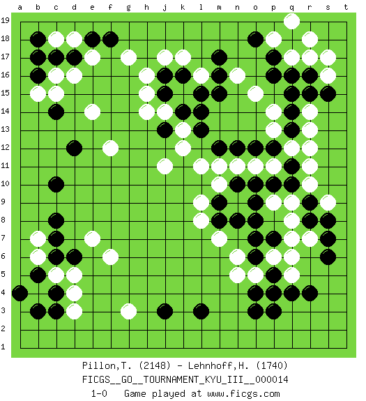 Last move : 1-0 2011 January 6 14:44:50 [Event "FICGS__GO__TOURNAMENT_KYU_III__000014"] [Site "FICGS"] [Date "2010.12.22"] [Round "1"] [Black "Pillon,Thibault"] [White "Lehnhoff,Heinz-Georg"] [Result "1-0"] [Rating 1 "2148"] [Rating 2 "1740"] 1.q16 d4 2.r4 d16 3.o3 r10 4.c10 r13 5.c14 g17 6.c6 g3 7.m17 k17 8.m15 c5 9.d6 r7 10.l3 r17 11.r16 q17 12.p17 s16 13.q18 r18 14.s15 p18 15.o18 q19 16.p16 e14 17.d12 f12 18.c17 c16 19.b16 b15 20.b17 c15 21.e18 e17 22.f18 f6 23.c3 d3 24.b5 q5 25.q4 p4 26.p3 n5 27.o4 o5 28.p5 p6 29.q11 r11 30.q13 b4 31.c4 d5 32.b3 b6 33.a4 q12 34.p12 r12 35.q14 k15 36.l13 l11 37.j13 j11 38.j3 k13 39.k14 k12 40.l14 j14 41.j15 h14 42.j16 j17 43.k16 e7 44.c8 h16 45.s6 l16 46.l15 h15 47.r8 q8 48.r9 q9 49.s7 s9 50.s8 s17 51.q10 p11 52.p10 o11 53.o10 p13 54.o12 n11 55.n10 m10 56.n12 m11 57.n8 m7 58.p7 q7 59.o6 q6 60.o8 n6 61.o7 n9 62.m9 l9 63.m8 l8 64.p4 r14 65.r15 p14 66.q15 o15 67.m12 d18 68.d17 c18 69.b18 n16 70.m16 b7 71.c7 p9 72.o9 1-0 Here are the names of the openings (joseki) played in the four corners : Corner q16 : q16 r13 Hoshi (Hwajeom, Seongjeom, Xingwei`) 4-4 Point. The star or hoshi (4-4) point, emphasizing influence at the potential expense of territory. Niken Kakari (Dukan Keolch'im, E`r Gua`jiao~, 2-Space Low Approach). Black typically answers by 7-3 or 3-5 (which is not joseki). Corner d16 : d16 c14 Hoshi (Hwajeom, Seongjeom, Xingwei`) 4-4 Point. The star or hoshi (4-4) point, emphasizing influence at the potential expense of territory. Ikken Kakari (Hankan Keolch'im, Yi Gua`jiao~, 1-Space Low Approach). Black 2 is the standard approach move to the 4-4. Corner d4 : d4 c6 Hoshi (Hwajeom, Seongjeom, Xingwei`) 4-4 Point. The star or hoshi (4-4) point, emphasizing influence at the potential expense of territory. Ikken Kakari (Hankan Keolch'im, Yi Gua`jiao~, 1-Space Low Approach). Black 2 is the standard approach move to the 4-4. Player Black won this Go (weiqi, baduk) game. Follow this game move after move (download)Keshi is worth as much as an invasion ! (Anonymous) For peace of mind, resign as general manager of the universe. (Douglas Adams)