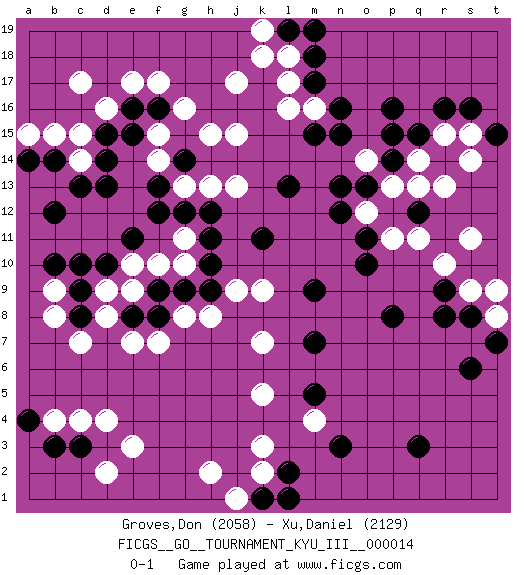 Last move : 0-1 2011 January 24 7:22:13 [Event "FICGS__GO__TOURNAMENT_KYU_III__000014"] [Site "FICGS"] [Date "2010.12.22"] [Round "1"] [Black "Groves,Don"] [White "Xu,Daniel"] [Result "0-1"] [Rating 1 "2058"] [Rating 2 "2129"] 1.r16 d4 2.q3 d16 3.p16 r10 4.r8 r13 5.p8 k3 6.n3 k5 7.m5 k7 8.o10 s15 9.s16 r15 10.q15 q14 11.p14 p13 12.q12 o14 13.p15 q13 14.o13 o12 15.n13 p11 16.n12 q11 17.o11 j17 18.c10 c7 19.d14 c14 20.c13 c15 21.d13 f17 22.m17 e3 23.m7 e10 24.b14 b15 25.a14 a15 26.b12 k9 27.m9 s9 28.s8 d9 29.t15 s14 30.h10 h8 31.k11 l16 32.g9 g8 33.f9 d8 34.f12 j15 35.d15 c17 36.l2 k2 37.k1 j1 38.l1 h2 39.g14 j13 40.h12 m16 41.n16 l17 42.m18 l18 43.l19 k19 44.m19 k18 45.n15 b9 46.b10 t8 47.t7 t9 48.s6 h15 49.e16 e17 50.f16 g16 51.c9 b8 52.c3 c4 53.b3 b4 54.a4 d2 55.r9 s11 56.e11 f10 57.l13 g11 58.h11 g13 59.f13 h13 60.g12 f15 61.e15 f14 62.d10 e9 63.f8 f7 64.e8 e7 65.c8 g10 66.h9 j9 67.m15 m4 0-1 Here are the names of the openings (joseki) played in the four corners : Player White won this Go (weiqi, baduk) game. Follow this game move after move (download)Never try to cut bamboo joints. (Anonymous) You know what they say : You lie down with the Devil, you wake up in Hell. (Horatio Caine, C.S.I. Miami)