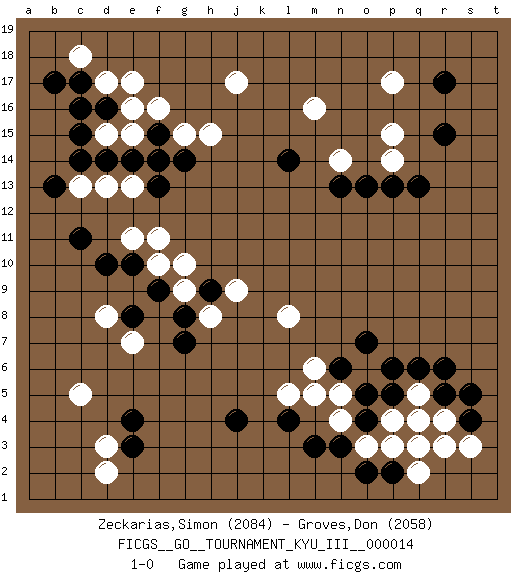 Last move : 1-0 2011 January 30 1:42:10 [Event "FICGS__GO__TOURNAMENT_KYU_III__000014 "] [Site "FICGS"] [Date "2010.12.22"] [Round "1"] [Black "Zeckarias,Simon "] [White "Groves,Don "] [Result "1-0"] [Rating 1 "2084"] [Rating 2 "2058"] 1.r15 c5 2.o4 d17 3.c15 f16 4.c17 c18 5.d16 e17 6.b17 j17 7.e4 p17 8.r17 p15 9.q13 d13 10.e14 e13 11.f15 g15 12.g14 e15 13.f14 d15 14.d14 e16 15.c16 c13 16.c14 h15 17.d10 d8 18.c11 e11 19.e10 f11 20.f13 f10 21.e8 e7 22.f9 g9 23.g8 h8 24.h9 g10 25.g7 j9 26.b13 d3 27.o13 p14 28.p13 n14 29.l14 m16 30.n13 r4 31.e3 d2 32.q4 r3 33.r5 q5 34.r6 p4 35.p5 q3 36.q6 q4 37.o5 o3 38.n3 n4 39.o2 p3 40.m3 n5 41.n6 o6 42.p6 m6 43.o7 l5 44.l4 m5 45.j4 l8 46.p2 q2 47.s4 s3 48.s5 1-0 Here are the names of the openings (joseki) played in the four corners : Corner d16 : d17 c15Komoku (Somok, Xiao~mu`) 3-4 Point. The komoku (3-4) point is the traditional corner enclosure move..Ikken Kakari (Hankan Keolch'im, Yi Gua`jiao~, 1-Space Low Pincer). The small knight move is the basic approach move to the 3-4 point stone. It has been continually used for over four centuries. There are limitless variations, with new moves constantly being discovered. Black 2 opens the door to a treaure store of joseki. Corner d4 : c5 e4Mokuhazushi (Waemok, Wai`mu`) 5-3 Point. The mokuhazushi (5-3) point was popular in the Edo period in Japan (1600 - 1867). It emphasizes influence; territorially, it is inferior to the 3-4 point.Takamoku Kakari. Black prevents White from gaining influence, but in the local context, abandoning profit in the corner entails a loss. White 3-4 and 4-4 are best. Corner q16 : r15 p17Mokuhazushi (Waemok, Wai`mu`) 5-3 Point. The mokuhazushi (5-3) point was popular in the Edo period in Japan (1600 - 1867). It emphasizes influence; territorially, it is inferior to the 3-4 point. Corner q4 : o4 r4Ootakamoku (Chaogao) 6-4 Point. The large takamoku (high) point (6-4), experimented with during the "new fuseki" movement in Japan in the 1930's. This point is seldom played as the initial corner point nowadays. Player Black won this Go (weiqi, baduk) game.Follow this game move after move (download ) Territory is a closed space where time no longer exists. The transformation around it slower alter it, and sometimes it cracks open like a rotten egg at the least shock. (Pierre Audouard) Locking firmely the window serves nothing, only small thiefs pass through there, the big thiefs enter through the front door. (Luc-Olivier Leclerc)