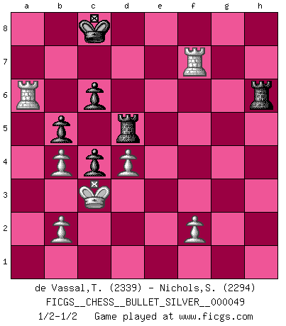 Last move : 1/2-1/2 2010 December 23 23:16:40 [Event "FICGS__CHESS__BULLET_SILVER__000049"] [Site "FICGS"] [Date "2010.12.23"] [Round "1"] [White "de Vassal,Thibault"] [Black "Nichols,Scott"] [Result "1/2-1/2"] [WhiteElo "2339"] [BlackElo "2294"] 1.d4 e6 2.c4 d5 3.Nf3 c6 4.Nc3 dxc4 5.Bg5 Nf6 6.e4 b5 7.e5 h6 8.Bh4 g5 9.Nxg5 hxg5 10.Bxg5 Nbd7 11.exf6 Bb7 12.h4 Nxf6 13.Qf3 Be7 14.O-O-O Nd5 15.Bxe7 Qxe7 16.Ne4 O-O-O 17.h5 Kb8 18.Qg3+ Ka8 19.Be2 Rdg8 20.Qe5 f6 21.Qd6 f5 22.Qxe7 Nxe7 23.Nc5 Rxg2 24.Rdf1 Bc8 25.Bf3 R2g8 26.Re1 Nd5 27.Nxe6 Kb8 28.Kd2 Nb4 29.Re2 Rh6 30.a3 Bxe6 31.axb4 Rd8 32.Kc3 Bd5 33.Bxd5 Rxd5 34.Re7 Rd8 35.Rf7 f4 36.Rxf4 Rd5 37.Rg1 R6xh5 38.Rf7 Rh8 39.R1g7 a6 40.Rb7+ Ka8 41.Ra7+ Kb8 42.Rgb7+ Kc8 43.Rf7 Kb8 44.Rxa6 Rh6 45.Rb6+ Kc8 46.Ra6 1/2-1/2 Queen's pawn Queenside Castling by player White (move 14) Queenside Castling by player Black (move 16) This chess game ended in a draw. Follow this game move after move (download)Chess is a fighting game which is purely intellectual and includes chance. (Richard Reti) Im Leben werden Partien nie so unstrittig gewonnen wie im Spiel (Emanuel Lasker) De todos mis libros Rusos, la defensa contiene y difunde el 'calor' mas grande que pudiese verse extraño al observar lo supremamente abstracto que el Ajedrez supuestamente es. (Vladimir Nabokov) Je ne crois pas en la psychologie, je crois aux bons coups. (Robert Fischer) Kids, you tried your best and you failed miserably. The lesson is, never try. (Simpsons)