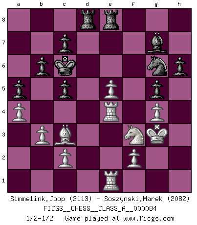 Last move : 1/2-1/2 2011 February 5 21:31:49 [Event "FICGS__CHESS__CLASS_A__000084"] [Site "FICGS"] [Date "2010.12.24"] [Round "1"] [White "Simmelink,Joop"] [Black "Soszynski,Marek"] [Result "1/2-1/2"] [WhiteElo "2113"] [BlackElo "2082"] 1.e4 e5 2.Nf3 Nc6 3.Bb5 Nf6 4.O-O Nxe4 5.d4 Nd6 6.Bxc6 dxc6 7.dxe5 Nf5 8.Qxd8+ Kxd8 9.Nc3 Bd7 10.Rd1 Kc8 11.Ng5 Be8 12.Rd3 h6 13.Nf3 b6 14.h3 Kb7 15.b3 g5 16.Bb2 Bg7 17.a4 a5 18.Rad1 f6 19.g4 Ne7 20.Ne4 f5 21.Ng3 fxg4 22.hxg4 Rg8 23.Nf5 Nd5 24.Re1 Nf4 25.Rde3 Bg6 26.Ne7 Rge8 27.Nxg6 Nxg6 28.Kg2 Rad8 29.Kg3 c5 30.Re4 Kc6 31.Bc3 1/2-1/2 Ruy Lopez : Berlin defense, Open variation Kingside Castling by player White (move 4) This chess game ended in a draw. Follow this game move after move (download)Live, lose, and learn, by observing your opponent how to win. (Amber Steenbock) Wie ich sie so einen nach dem anderen nieder mähte wurde meine Überlegenheit offensichtlich. (José Raúl Capablanca) El Ajedrez es una hermosa aventura. (Bent Larsen) Il vaut mieux sacrifier les pièces de l'adversaire. (Xavier Tartacover) He who laughs last probably does not get the joke. (Unknown)