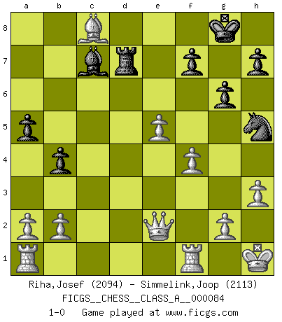 Last move : 1-0 2010 December 30 23:1:29 [Event "FICGS__CHESS__CLASS_A__000084"] [Site "FICGS"] [Date "2010.12.24"] [Round "1"] [White "Riha,Josef"] [Black "Simmelink,Joop"] [Result "1-0"] [WhiteElo "2094"] [BlackElo "2113"] 1.Nf3 d5 2.d4 c6 3.c4 Nf6 4.Nc3 e6 5.e3 Nbd7 6.Qc2 Bd6 7.Bd3 dxc4 8.Bxc4 b5 9.Bd3 Bb7 10.O-O O-O 11.e4 e5 12.dxe5 Nxe5 13.Nxe5 Bxe5 14.h3 b4 15.Ne2 c5 16.f3 c4 17.Qxc4 a5 18.Rd1 Qb6+ 19.Kh1 Ba6 20.Qc2 Rfc8 21.Qb1 Nh5 22.f4 Bc7 23.e5 Rd8 24.Qc2 Bb7 25.Rf1 g6 26.Be4 Rac8 27.Be3 Qxe3 28.Bxb7 Rd2 29.Qc4 Qxe2 30.Qxe2 Rd7 31.Bxc8 1-0 Reti Opening Kingside Castling by player White (move 10) Kingside Castling by player Black (move 10) Player White won this chess game. Follow this game move after move (download)Chess mastery essentially consists of analyzing Chess positions accurately. (Mikhail Botvinnik) Man kann eine Schachpartie nur gewinnen, wenn das Gleichgewicht gestört ist. In einer Stellung mit ungestörtem Gleichgewicht ist auch das größte Genie hilflos - in der Stellung steckt dann eben kein genialer Einfall. (Wilhelm Steinitz) Aquel que toma al Peón de Caballo de la Reina, se pasará la noche a dormir en la calle. (Anónimo) Tous ces prétendus hommes politiques sont les pions, les Cavaliers, les Tours ou les Fous d'une partie d'échecs qui se jouera tant qu'un hasard ne renversera pas l'échiquier. (Honoré de Balzac) No enterprise is more likely to succeed than one concealed from the enemy until it is ripe for execution. (Niccolo Machiavelli)