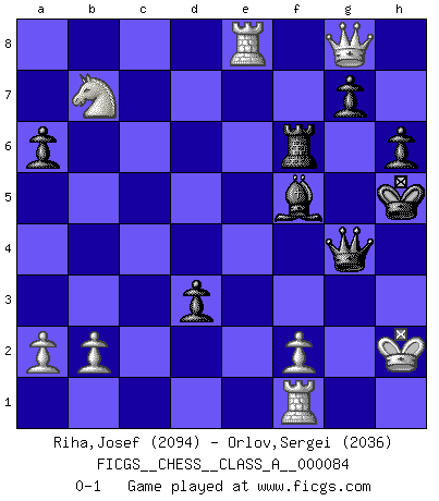 Last move : 0-1 2011 January 1 17:52:44 [Event "FICGS__CHESS__CLASS_A__000084"] [Site "FICGS"] [Date "2010.12.24"] [Round "1"] [White "Riha,Josef"] [Black "Orlov,Vladimir"] [Result "0-1"] [WhiteElo "2094"] [BlackElo "2036"] 1.e4 e6 2.d4 d5 3.Nd2 Nf6 4.e5 Nfd7 5.Bd3 c5 6.c3 Nc6 7.Ne2 cxd4 8.cxd4 f6 9.exf6 Nxf6 10.O-O Bd6 11.Nf3 Qc7 12.h3 O-O 13.Be3 Bd7 14.Rc1 Rae8 15.Nc3 a6 16.Na4 Qa5 17.Bd2 Qd8 18.Qc2 Kh8 19.Nc5 Bc8 20.Bg5 e5 21.dxe5 Nxe5 22.Nxe5 Rxe5 23.Bf4 Qe7 24.Qc3 Bxh3 25.Nxb7 Nh5 26.Bg3 Rg5 27.Bxd6 Rxg2+ 28.Kh1 Qh4 29.Bf5 Bxf5 30.Kxg2 d4 31.Qa3 d3 32.Kg1 Rf6 33.Rce1 h6 34.Re8+ Kh7 35.Qb3 Qg5+ 36.Kh2 Nf4 37.Qg8+ Kg6 38.Bxf4 Qxf4+ 39.Kg1 Qg4+ 40.Kh2 Kh5 0-1 French : Tarrasch, Closed variation Kingside Castling by player White (move 10) Kingside Castling by player Black (move 12) Player Black won this chess game. Follow this game move after move (download)What would Chess be without silly mistakes ? (Kurt Richter) Ich verstehe mehr vom Schach als irgendein anderer lebender Meister. (José Raúl Capablanca) Fischer no está bajo la obligación de nadie. (Joseph Platz) Les pièces de l'échiquier étaient impitoyables. Elles le retenaient, elles l'absorbaient. Il y avait de l'horreur en cela, mais aussi une harmonie unique. Car, qu'y a-t-il dans le monde, à part les échecs ? (V. Nabokov) I can't decide which is riskier; taking crazy risks, or taking advice on crazy risks from a crazy risk taker. (Gregory House in House M.D.)