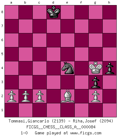 Last move : 1-0 2011 April 15 16:45:1 [Event "FICGS__CHESS__CLASS_A__000084"] [Site "FICGS"] [Date "2010.12.24"] [Round "1"] [White "Tommasi,Giancarlo"] [Black "Riha,Josef"] [Result "1-0"] [WhiteElo "2139"] [BlackElo "2094"] 1.e4 c5 2.Nf3 d6 3.d4 cxd4 4.Nxd4 Nf6 5.Nc3 Nc6 6.Bg5 e6 7.Qd2 a6 8.O-O-O Bd7 9.f3 Be7 10.h4 h6 11.Be3 h5 12.Bg5 Ne5 13.Qe1 b5 14.f4 Neg4 15.e5 b4 16.exf6 gxf6 17.Ne4 fxg5 18.hxg5 Qb6 19.Ng3 h4 20.Qe2 e5 21.Ngf5 Bxf5 22.Nxf5 Nf2 23.fxe5 d5 24.Nd6+ Kf8 25.Qf3 Bxd6 26.g6 Ra7 27.exd6 Kg7 28.Rxd5 fxg6 29.Qe2 Rf7 30.Qe5+ Rf6 31.Bc4 Nxh1 32.Qe7+ Rf7 33.Qxf7+ Kxf7 34.Rb5 Kf6 35.Rxb6 Rd8 36.Bxa6 Ke5 37.Rb5+ Kxd6 38.Rxb4 g5 39.Rd4+ Kc7 40.Rxd8 Kxd8 41.Be2 Nf2 42.Kd2 g4 43.Ke3 g3 44.Kf4 Ne4 45.Kg4 1-0 Sicilian : Richter-Rauzer, Rauzer attack, 7...a6 Queenside Castling by player White (move 8) 10 pieces endgame at move 40 : White KBPPPP , Black KNPP WHITE : King + 1 Bishop 4 Pawns BLACK : King + 1 Knight 2 Pawns Player White won this chess game. Follow this game move after move (download)Chess is a fairy tale of 1001 blunders. (Savielly Tartakower) Gegen einen Schachcomputer zu verlieren ist wie Löcher in den Strümpfen zuhaben. Es ist nicht peinlich, solange man der einzige ist der es weiß. (Anonymous) El Ajedrez es tan interesante por sí solo, que no es necesario un interés monetario para persuadir a una persona a que lo practique; por lo tanto, nunca se juega por dinero. (Benjamin Franklin) Le thème de l'attaque double intervient d'une manière ou d'une autre dans l'immense majorité des combinaisons. (Youri Averbakh) There are two major products that came out of Berkeley: LSD and UNIX. We do not believe this is to be a coincidence. (Jeremy S. Anderson)