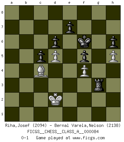 Last move : 0-1 2011 March 2 14:23:14 [Event "FICGS__CHESS__CLASS_A__000084"] [Site "FICGS"] [Date "2010.12.24"] [Round "1"] [White "Riha,Josef"] [Black "Bernal Varela,Nelson"] [Result "0-1"] [WhiteElo "2094"] [BlackElo "2138"] 1.d4 Nf6 2.c4 g6 3.g3 Bg7 4.Bg2 c5 5.d5 d6 6.Nf3 b5 7.cxb5 Qa5+ 8.Nc3 Ne4 9.O-O Nxc3 10.bxc3 a6 11.bxa6 Bxc3 12.Bd2 Bxd2 13.Qxd2 Qxd2 14.Nxd2 Bxa6 15.Ne4 f5 16.Nc3 Nd7 17.Rfe1 Ne5 18.f4 Nc4 19.e4 Na3 20.Rac1 Kf7 21.exf5 gxf5 22.Re3 Rhb8 23.Bh3 Bc8 24.Bf1 Ra7 25.Rce1 Nc2 26.Nb5 Rab7 27.Nc3 Nxe3 28.Rxe3 Rb2 29.Bd3 Ra8 30.a4 Bd7 31.Re1 Kf6 32.Ra1 Rb3 33.Rc1 Bxa4 34.Bf1 Be8 35.Bc4 Rb2 36.Be2 Ra5 37.Kf1 Ra3 38.Ke1 h6 39.h3 Ba4 40.h4 Kg7 41.h5 Kf6 42.Nxa4 Rxa4 43.Rd1 R4a2 44.Bc4 Ra3 45.Rd2 Rxd2 46.Kxd2 Rxg3 0-1 King's Indian : 3.g3 Kingside Castling by player White (move 9) Player Black won this chess game. Follow this game move after move (download)I like to say that Bobby Fischer was the greatest player ever. But what made Fischer a genius was his ability to blend an American freshness and pragmatism with Russian ideas about strategy. (Bruce Pandolfini) Das typische an einem Großmeister ist, daß er eine gewonnene Position schnell und schmerzlos gewinnt. (Irving Chernev) Alekhine es un poeta que crea un trabajo de arte de algo que raramente inspiraría a otra persona a mandar una tarjeta postal. (Max Euwe) Le moment que je préfère le plus dans une rencontre, c'est celui où je sens que la personnalité de l'adversaire se brise. (Robert Fischer) Who needs drugs and alcohol if he can play Big Chess at FICGS ? (Heinz-Georg Lehnhoff)