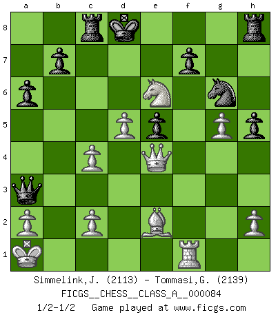 Last move : 1/2-1/2 2011 April 18 18:40:5 [Event "FICGS__CHESS__CLASS_A__000084"] [Site "FICGS"] [Date "2010.12.24"] [Round "1"] [White "Simmelink,Joop"] [Black "Tommasi,Giancarlo"] [Result "1/2-1/2"] [WhiteElo "2113"] [BlackElo "2139"] 1.e4 c5 2.Nf3 d6 3.d4 cxd4 4.Nxd4 Nf6 5.Nc3 a6 6.Be3 e6 7.g4 h6 8.Qf3 Nbd7 9.Rg1 Ne5 10.Qh3 h5 11.g5 Nfg4 12.O-O-O Ng6 13.Be2 Nxe3 14.Qxe3 e5 15.Nf5 Be6 16.Nb5 d5 17.Rxd5 Bxd5 18.exd5 Bb4 19.Nc3 Rc8 20.Qe4 Bxc3 21.bxc3 Qb6 22.Nxg7+ Kd8 23.Rg3 Qxf2 24.Rf3 Qg1+ 25.Kb2 Qb6+ 26.Ka1 Qg1+ 27.Rf1 Qc5 28.c4 Qa3 29.Ne6+ 1/2-1/2 Sicilian : Najdorf, Byrne (English) attack Queenside Castling by player White (move 12) This chess game ended in a draw. Follow this game move after move (download)Examine moves that smite! A good eye for smites is far more important than a knowledge of strategical principles. (Purdy) Aljechin war kein Nazi. Er war ein Opportunist. Ein schrecklicher Mann. Er liebte Geld über alles und würde für Geld ein Jude, ein Katolik oder ein Protestant werden. (Miguel Najdorf) No nos podemos resistir a la fascinación de un sacrificio ya que la pasión por los sacrificios es parte de la naturaleza de un jugador de Ajedrez. (Rudolf Spielman) Les échecs, c'est la lutte contre l'erreur. (Johannes Zukertort) The smarter you play, the luckier you'll be. (Mark Pilarski)