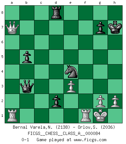 Last move : 0-1 2011 May 2 6:28:22 [Event "FICGS__CHESS__CLASS_A__000084"] [Site "FICGS"] [Date "2010.12.24"] [Round "1"] [White "Bernal Varela,Nelson"] [Black "Orlov,Vladimir"] [Result "0-1"] [WhiteElo "2138"] [BlackElo "2036"] 1.e4 e6 2.d4 d5 3.Nd2 Nf6 4.e5 Nfd7 5.Bd3 c5 6.c3 Nc6 7.Ne2 cxd4 8.cxd4 f6 9.Nf4 Nxd4 10.Qh5+ Ke7 11.exf6+ Nxf6 12.Ng6+ hxg6 13.Qxh8 Kf7 14.O-O e5 15.Nb3 Nxb3 16.axb3 e4 17.Be2 Be6 18.Bf4 Qb6 19.Rfc1 Re8 20.Qh4 d4 21.Qg3 d3 22.Bd1 Bc5 23.Bc7 Qb5 24.Ba5 Bd4 25.Bd2 Kg8 26.Ra4 Bb6 27.Rca1 Rf8 28.Be3 Bxb3 29.Bxb3+ Qxb3 30.Bxb6 Qxb6 31.Qxg6 d2 32.Qg5 Qxb2 33.Qc5 b5 34.Rxa7 e3 35.fxe3 Rd8 36.Rd1 Qb3 37.R7a1 Ne4 38.Qa3 Qc3 39.Qa7 Kh7 40.Rf1 Qb3 0-1 French : Tarrasch, Closed variation Kingside Castling by player White (move 14) Player Black won this chess game. Follow this game move after move (download)No price is too great for the scalp of the enemy King. (Koblentz) Gewinnen beim Schach fördert das Selbstvertrauen. Beim Sex spüre ich sowas nicht... (Garry Kasparov) Un jugador que trata de regresar una movida en el Ajedrez es un futuro carterista. (Richard Fenton) Je fais ceci parce que dans cinquante coups j'obtiendrai cela; je m'appelle Mikhail Moisevitch Botvinnik. (Botvinnik) The right perception of any matter and a misunderstanding of the same matter do not wholly exclude each other. (Kafka's the trial)
