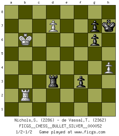 Last move : 1/2-1/2 2010 December 24 15:19:59 [Event "FICGS__CHESS__BULLET_SILVER__000052"] [Site "FICGS"] [Date "2010.12.24"] [Round "1"] [White "Nichols,Scott"] [Black "de Vassal,Thibault"] [Result "1/2-1/2"] [WhiteElo "2286"] [BlackElo "2362"] 1.c4 e5 2.Nc3 Nf6 3.Nf3 Nc6 4.g3 Bb4 5.Bg2 O-O 6.O-O Re8 7.Nd5 Nxd5 8.cxd5 Nd4 9.Nxd4 exd4 10.e3 Bc5 11.b3 b6 12.Bb2 Ba6 13.Re1 Qf6 14.Qc2 dxe3 15.dxe3 Qg6 16.Qxg6 hxg6 17.a4 Bb4 18.Rec1 Bd6 19.Ba3 Rac8 20.a5 Be5 21.Ra2 Bd3 22.h4 Kh7 23.Bb4 f6 24.Bh3 Bb5 25.axb6 axb6 26.Ra7 Ra8 27.Rxa8 Rxa8 28.f4 Bd6 29.Bxd6 cxd6 30.e4 Ra3 31.Bf1 Bxf1 32.Kxf1 Rxb3 33.Kf2 Rb2+ 34.Ke3 Rb3+ 35.Kd4 f5 36.Rc7 Rb4+ 37.Kc3 Rxe4 38.Rxd7 Re3+ 39.Kc4 Rxg3 40.Rxd6 Rf3 41.Rxb6 Rxf4+ 42.Kc5 Rf3 43.d6 Rd3 44.Kc6 f4 45.d7 f3 46.Rb2 Rc3+ 47.Kb6 Rd3 1/2-1/2 English Opening Kingside Castling by player Black (move 5) Kingside Castling by player White (move 6) 10 pieces endgame at move 41 : White KRPPP , Black KRPPP WHITE : King + 1 Rook 3 Pawns BLACK : King + 1 Rook 3 Pawns 9 pieces endgame at move 41 : White KRPP , Black KRPPP WHITE : King + 1 Rook 2 Pawns BLACK : King + 1 Rook 3 Pawns This chess game ended in a draw. Follow this game move after move (download)When the Chess game is over, the Pawn and the King go back to the same box. (Irish saying) Ich bewundere Kasparows phantasievolle Angriffssiege aus den Achtzigern und Neunzigern, aber wenn man sie mit dem Computer überprüft, nimmt der Computer in jeder zweiten Partie die Opfer an, verteidigt sich und gewinnt. (Vladimir Kramnik) Los problemas de Ajedrez exigen del compositor las mismas virtudes que caracterizan todo el arte de valor: originalidad, invención, concisión, armonía, complejidad e insinceridad explendida. (Vladimir Nabokov) Plusieurs personnes se sont demandées comment Tal faisait pour gagner... En fait, c'est très simple ! Il met ses pièces au centre de l'échiquier et les sacrifie quelque part ! (David Bronstein) The difference between stupidity and genius is that genius has its limits. (Murphy)
