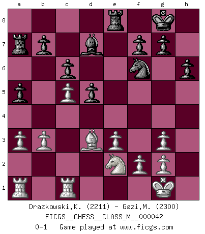 Last move : 0-1 2011 May 22 21:34:59 [Event "FICGS__CHESS__CLASS_M__000042"] [Site "FICGS"] [Date "2010.12.25"] [Round "1"] [White "Drazkowski,Krzysztof"] [Black "Gazi,Miroslav"] [Result "0-1"] [WhiteElo "2211"] [BlackElo "2300"] 1.d4 d5 2.Nf3 Nf6 3.c4 e6 4.Nc3 c6 5.cxd5 exd5 6.Bg5 h6 7.Bh4 Bd6 8.Qc2 O-O 9.e3 Be6 10.Bd3 Nbd7 11.a3 Re8 12.O-O Qc7 13.Bg3 Bxg3 14.hxg3 Nb6 15.b3 Qe7 16.Rfc1 a5 17.Ne5 Ra7 18.Ne2 Nbd7 19.Nxd7 Bxd7 20.Qc5 Qxc5 21.dxc5 0-1 Queen's pawn game Kingside Castling by player Black (move 8) Kingside Castling by player White (move 12) Player Black won this chess game. Follow this game move after move (download)Excellence at Chess is one mark of a scheming mind. (Sir Arthur Conan Doyle) Das Schachspiel hat wie die Liebe, die Musik, die Fähigkeit, den Menschen glücklich zu machen. Ich habe ein leises Gefühl des Bedauerns für jeden, der das Schachspiel nicht kennt, so wie ich jeden bedaure, der die Liebe nicht kennt. (Siegbert Tarrasch) El Ajedrez es un regaderazo frío para la mente. (Sir John Simon) J'apprécie les joueurs d'est-indienne, c'est grâce à eux que je nourris ma famille depuis tant d'années. (Petrosian) Any activity becomes creative when the doer cares about doing it right or doing it better. (John Updike)
