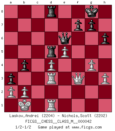 Last move : 1/2-1/2 2011 February 24 15:21:56 [Event "FICGS__CHESS__CLASS_M__000042"] [Site "FICGS"] [Date "2010.12.25"] [Round "1"] [White "Laskov,Andrei"] [Black "Nichols,Scott"] [Result "1/2-1/2"] [WhiteElo "2204"] [BlackElo "2202"] 1.e4 c5 2.Nf3 d6 3.d4 cxd4 4.Nxd4 Nf6 5.Nc3 a6 6.Bg5 Nc6 7.Qd2 e6 8.O-O-O Bd7 9.f4 h6 10.Bh4 Be7 11.Nf3 b5 12.e5 dxe5 13.fxe5 Nd5 14.Nxd5 Bxh4 15.Nxh4 exd5 16.Qxd5 Rc8 17.Qe4 Qe7 18.Bd3 Nb4 19.Kb1 Nxd3 20.cxd3 O-O 21.Nf5 Bxf5 22.Qxf5 Rcd8 23.d4 Rd5 24.Rd2 Rfd8 25.Rhd1 a5 26.Qf3 a4 27.Rd3 b4 28.h3 Qe6 29.g4 a3 1/2-1/2 Sicilian : Najdorf, 6.Bg5 Queenside Castling by player White (move 8) Kingside Castling by player Black (move 20) This chess game ended in a draw. Follow this game move after move (download)One doesn't have to play well, it's enough to play better than your opponent. (Siegbert Tarrasch) Mein erstes Ziel war nicht, die Partie zu gewinnen, sondern eine Figur zu opfern. -- der junge (Wilhelm Steinitz) Solo los afeminados hacen el Enroque. (Rob Sillars) Le thème de l'attaque double intervient d'une manière ou d'une autre dans l'immense majorité des combinaisons. (Youri Averbakh) Mac users swear by their computers. PC users swear at their computers. (Author unknown)