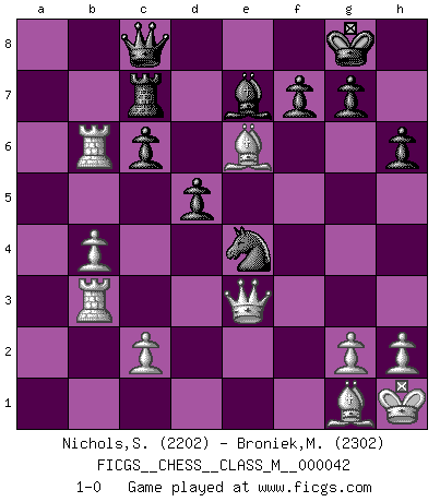 Last move : 1-0 2011 June 22 16:50:26 [Event "FICGS__CHESS__CLASS_M__000042"] [Site "FICGS"] [Date "2010.12.25"] [Round "1"] [White "Nichols,Scott"] [Black "Broniek,Mariusz Maciej"] [Result "1-0"] [WhiteElo "2202"] [BlackElo "2302"] 1.e4 c5 2.Nf3 d6 3.d4 cxd4 4.Nxd4 Nf6 5.Nc3 a6 6.Be2 e6 7.O-O Be7 8.f4 O-O 9.a4 Qc7 10.Kh1 Rd8 11.Be3 Nbd7 12.a5 Nc5 13.Nb3 Bd7 14.Bf3 Bc6 15.Qe1 Rd7 16.Ra3 R7d8 17.Bg1 Bf8 18.Nd4 Re8 19.b4 Ncd7 20.Nxc6 bxc6 21.Rb3 e5 22.fxe5 Nxe5 23.Be2 Qb7 24.Qf2 Re6 25.Qb6 Qc8 26.Qd4 h6 27.Rd1 Be7 28.Na4 Ned7 29.Nb6 Nxb6 30.axb6 Rxe4 31.Qf2 Bd8 32.Bd3 d5 33.Ra1 Re6 34.Bf5 Rb8 35.b7 Rxb7 36.Rxa6 Ne4 37.Qe3 Be7 38.Rb6 Rc7 39.Bxe6 1-0 Sicilian : Najdorf, Opovcensky variation Kingside Castling by player White (move 7) Kingside Castling by player Black (move 8) Player White won this chess game. Follow this game move after move (download)I feel as if I were a piece in a game of Chess, when my opponent says of it: That piece cannot be moved. (Soren Kierkegaard) Das Schach hält seine Meister in eigenen Banden, Fesseln; auf vielerlei Weise formt es ihren Geist, so dass die innere Freiheit selbst des Stärksten beeinflusst wird. (Albert Einstein) En partidas rápidas, el Caballo es mas poderoso que el Alfil. (Vlastimil Hort) Pour moi, les échecs ne sont pas un jeu mais un art. (Alexandre Alekhine) You know what they say : You lie down with the Devil, you wake up in Hell. (Horatio Caine, C.S.I. Miami)