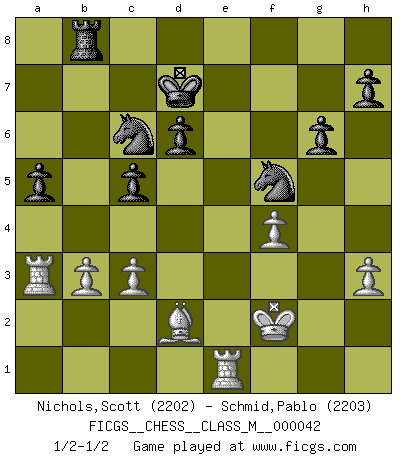 Last move : 1/2-1/2 2011 May 12 21:52:32 [Event "FICGS__CHESS__CLASS_M__000042"] [Site "FICGS"] [Date "2010.12.25"] [Round "1"] [White "Nichols,Scott"] [Black "Schmid,Pablo"] [Result "1/2-1/2"] [WhiteElo "2202"] [BlackElo "2203"] 1.e4 e5 2.Nf3 Nc6 3.Bb5 a6 4.Ba4 Nf6 5.O-O Be7 6.Re1 b5 7.Bb3 d6 8.c3 O-O 9.h3 Na5 10.Bc2 c5 11.d4 Nd7 12.d5 Nb6 13.Nbd2 Qe8 14.b3 f5 15.exf5 Bxf5 16.Bxf5 Rxf5 17.Ne4 Qf7 18.Ng3 Rxf3 19.Qxf3 Qxf3 20.gxf3 Nxd5 21.Nf5 Kf7 22.f4 Nc6 23.Nxe7 Ndxe7 24.fxe5 Nxe5 25.Rd1 Ke6 26.a4 bxa4 27.f4 N5c6 28.Rxa4 a5 29.Kf2 Rb8 30.Ra3 g6 31.Re1+ Kd7 32.Bd2 Nf5 33.Be3 Re8 34.Bc1 Rb8 35.Bd2 1/2-1/2 Ruy Lopez : Closed Kingside Castling by player White (move 5) Kingside Castling by player Black (move 8) This chess game ended in a draw. Follow this game move after move (download)Nowadays, when you're not a grandmaster at 14, you can forget about it. (Anand Viswanathan) Wenn Spassky eine Figur opfert kannst du genauso gut aufgeben. Aber wenn Tal eine Figur opfert, spiel weiter. Er könnte noch eine weitere opfern, und dann ... wer weiß? (Miguel Najdorf) En la perfecta combinación de Ajedrez como en una historia corta de primera clase, toda la trama y contra trama deberá conducir hacia un final sorprendente, el interes no es mitigado hasta el último momento. (Yates and Winter) Toutes choses étant égales, c'est la conviction qui gagne. Alliée à une volonté de vaincre, elle sert de détonateur, suscite des idées, disperse les doutes et aide à penser clairement. (Robert Fischer) Real knowledge is to know the extent of one's ignorance. (Confucius)