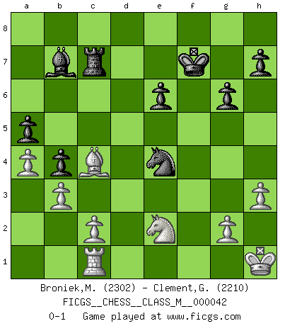 Last move : 0-1 2011 June 22 16:50:44 [Event "FICGS__CHESS__CLASS_M__000042"] [Site "FICGS"] [Date "2010.12.25"] [Round "1"] [White "Broniek,Mariusz Maciej"] [Black "Clement,George"] [Result "0-1"] [WhiteElo "2302"] [BlackElo "2210"] 1.e4 d6 2.d4 Nf6 3.Nc3 g6 4.f4 Bg7 5.Nf3 O-O 6.Be2 c5 7.dxc5 Qa5 8.O-O Qxc5+ 9.Kh1 Nbd7 10.Qe1 a6 11.Bd3 b5 12.e5 dxe5 13.fxe5 Ng4 14.e6 Nde5 15.Nxe5 Qxe5 16.Qxe5 Bxe5 17.h3 Nf6 18.exf7+ Rxf7 19.Bd2 Bb7 20.Rae1 Bg3 21.Rd1 Rc8 22.a4 b4 23.Ne2 Bd6 24.b3 Ne4 25.Be3 Rxf1+ 26.Rxf1 e6 27.Rc1 Kf7 28.Bc4 a5 29.Bb6 Bc7 30.Bxc7 Rxc7 0-1 Pirc : Austrian attack Kingside Castling by player Black (move 5) Kingside Castling by player White (move 8) Player Black won this chess game. Follow this game move after move (download)After black's reply to 1.e4 with 1..e5, leaves him always trying to get into the game. (Howard Staunton) Gott hat gewollt, dass ich Champion werde. (Surab Azmajparaschvili) Aquellos que dicen que entienden al Ajedrez, no entienden nada. (Robert Hubner) La menace est plus forte que l'exécution. (Aaron Nimzovitch) Establishing goals is all right if you don't let them deprive you of interesting detours. (Doug Larson)