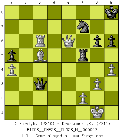 Last move : 1-0 2011 May 31 18:13:37 [Event "FICGS__CHESS__CLASS_M__000042"] [Site "FICGS"] [Date "2010.12.25"] [Round "1"] [White "Clement,George"] [Black "Drazkowski,Krzysztof"] [Result "1-0"] [WhiteElo "2210"] [BlackElo "2211"] 1.e4 c5 2.Nf3 Nc6 3.Bb5 g6 4.Bxc6 dxc6 5.d3 Bg7 6.h3 e5 7.O-O f6 8.Be3 b6 9.a4 a5 10.Na3 Nh6 11.c3 Nf7 12.d4 cxd4 13.cxd4 exd4 14.Nxd4 O-O 15.Qb3 c5 16.Ne2 f5 17.exf5 Bxf5 18.Rad1 Qf6 19.Nf4 Rab8 20.Nd5 Qe6 21.Bf4 Rb7 22.Rfe1 Be4 23.Qb5 Qf5 24.Qc4 Bxd5 25.Rxd5 Qf6 26.Re2 Kh8 27.Qe4 Qc6 28.Nb5 h6 29.h4 Re7 30.Qxe7 Qxd5 31.Nc3 Qd4 32.Bc7 Kg8 33.Qe6 Kh7 34.g3 Qd3 35.Bxb6 Bd4 36.Bc7 Bxc3 37.bxc3 Qxc3 38.Qe7 Kg8 39.Re6 Nh8 40.Bb6 Rf5 41.Rc6 Nf7 42.Qe6 Kh8 43.Bxc5 1-0 Sicilian : Nimzovich-Rossolimo attack (with ...g6, without ...d6) Kingside Castling by player White (move 7) Kingside Castling by player Black (move 14) Player White won this chess game. Follow this game move after move (download)Bobby is the finest Chess player this country ever produced. His memory for the moves, his brilliance in dreaming up combinations, and his fierce determination to win are uncanny. (John Collins) Schach sollte überall auf der Welt Schulfach werden. Es fördert die geistige Auseinandersetzung. Es lehrt die Demut in der Niederlage. (Garry Kasparov) Es el objetivo de la escuela moderna no tratar cada posición de acuerdo a una regla general, sino de acuerdo al principio inherente en la posición. (Richard Reti) Plusieurs personnes se sont demandées comment Tal faisait pour gagner... En fait, c'est très simple ! Il met ses pièces au centre de l'échiquier et les sacrifie quelque part ! (David Bronstein) See no evil, hear no evil, speak no evil. (The 3 monkeys)