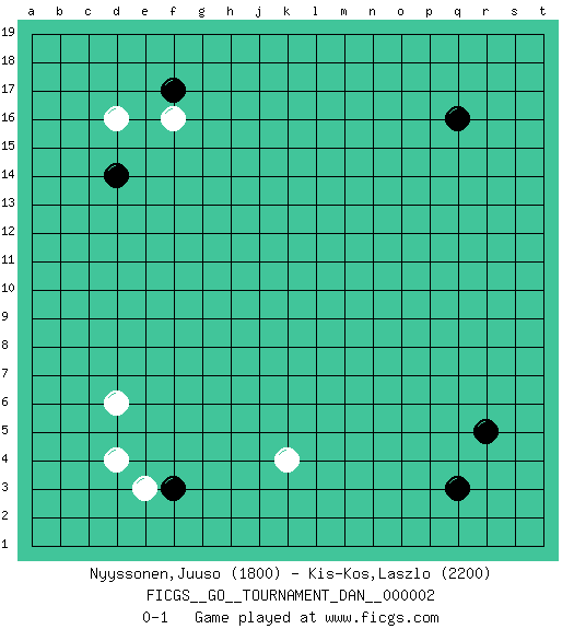 Last move : 0-1 2007 January 10 23:32:13 [Event "FICGS__GO__TOURNAMENT_DAN__000002"] [Site "FICGS"] [Date "2006.12.04"] [Round "1"] [Black "Nyyssonen,Juuso"] [White "Kis-Kos,Laszlo"] [Result "0-1"] [Rating 1 "1800"] [Rating 2 "2200"] 1.q16 d4 2.q3 d16 3.f3 d6 4.r5 k4 5.f17 e3 6.d14 f16 0-1 This go game has been lost on time (started : 2006.12.04 22:28:52) Here are the names of the openings (joseki) played in the four corners : Corner d4 : d4 f3 Hoshi (Hwajeom, Seongjeom, Xingwei`) 4-4 Point. The star or hoshi (4-4) point, emphasizing influence at the potential expense of territory. Ikken Kakari (Hankan Keolch'im, Yi Gua`jiao~, 1-Space Low Approach). Black 2 is the standard approach move to the 4-4. Corner d16 : d16 f17 Hoshi (Hwajeom, Seongjeom, Xingwei`) 4-4 Point. The star or hoshi (4-4) point, emphasizing influence at the potential expense of territory. Ikken Kakari (Hankan Keolch'im, Yi Gua`jiao~, 1-Space Low Approach). Black 2 is the standard approach move to the 4-4. Player White won this Go (weiqi, baduk) game. Follow this game move after move (download)In the corner, five stones in a row on the third line are alive. (Anonymous) They misunderestimated me. (George W. Bush, Bentonville nov. 6, 2000)