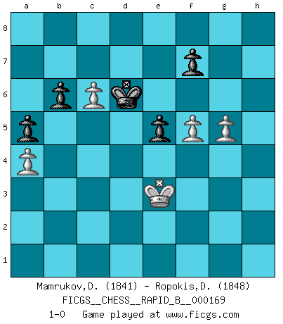 Last move : 1-0 2011 January 24 20:34:54 [Event "FICGS__CHESS__RAPID_B__000169"] [Site "FICGS"] [Date "2010.12.26"] [Round "1"] [White "Mamrukov,Dmitri"] [Black "Ropokis,Dimitrios"] [Result "1-0"] [WhiteElo "1841"] [BlackElo "1848"] 1.d4 d5 2.c4 e6 3.Nf3 c5 4.cxd5 exd5 5.g3 Nc6 6.Bg2 Nf6 7.O-O Be7 8.Nc3 cxd4 9.Nxd4 O-O 10.b3 Bg4 11.h3 Bb4 12.Bb2 Be6 13.a3 Bxc3 14.Bxc3 Re8 15.e3 Nxd4 16.Qxd4 b6 17.Rac1 Rc8 18.Bb2 Qd7 19.g4 h6 20.a4 Qe7 21.Rfd1 Qf8 22.f4 Red8 23.b4 Qd6 24.b5 Rxc1 25.Rxc1 Rc8 26.Rc3 Rxc3 27.Qxc3 Bd7 28.Kf2 Qe7 29.Bf3 Ne8 30.Qe5 Qb4 31.Qd4 Qxd4 32.Bxd4 h5 33.f5 hxg4 34.hxg4 Nf6 35.Bxf6 gxf6 36.Bxd5 Kf8 37.Kf3 Ke7 38.Kf4 Bc8 39.e4 a5 40.Ke3 Bd7 41.Bc6 Bxc6 42.bxc6 Kd6 43.e5+ fxe5 44.g5 1-0 Queen's gambit declined Kingside Castling by player White (move 7) Kingside Castling by player Black (move 9) 10 pieces endgame at move 43 : White KPPPP , Black KPPPP WHITE : King + 4 Pawns BLACK : King + 4 Pawns Player White won this chess game. Follow this game move after move (download)When you don't know what to do, wait for your opponent to get an idea - it's sure to be wrong. (Tarrasch) Offensichtlich kennt Kasparow nichts anderes als Schach, und ich könnte 500 weitere Spieler dieser Sorte benennen. (Judith Polgar) Los tropiezos estan todos ahí en el tablero, esperando que se cometan. (Savielly Tartakover) Mon pion favori sur ma case favorite ! Bronstein en parlant d'un coup de pion en h5 quand il avait les Noirs. God, you are such an idiot. - Actually, I thought I was more of a jerk. (Gregory House to Stacy Warner, House M.D.)