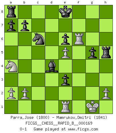 Last move : 0-1 2011 February 14 4:0:53 [Event "FICGS__CHESS__RAPID_B__000169"] [Site "FICGS"] [Date "2010.12.26"] [Round "1"] [White "Parra,Jose"] [Black "Mamrukov,Dmitri"] [Result "0-1"] [WhiteElo "1800"] [BlackElo "1841"] 1.e4 c6 2.d4 d5 3.e5 Bf5 4.Bd3 Bxd3 5.Qxd3 e6 6.f4 Ne7 7.Nf3 Nf5 8.O-O c5 9.c3 Nc6 10.g4 Nh4 11.f5 cxd4 12.cxd4 Nxf3+ 13.Rxf3 Qb6 14.fxe6 fxe6 15.Rf4 Be7 16.Nc3 g5 17.Rf1 Qxd4+ 18.Qxd4 Nxd4 19.Bd2 h5 20.gxh5 Rxh5 21.Rf2 Nc6 22.Re1 Bc5 23.Be3 d4 24.Na4 dxe3 25.Rf6 Bd4 0-1 Caro-Kann : Advance variation Kingside Castling by player White (move 8) Player Black won this chess game. Follow this game move after move (download)Strategy requires thought, tactics require observation. (Max Euwe) Es liegt in der Natur, vernüftig zu denken und unlogisch zu handeln. (Anatole France) El Ajedrez es un invernadero donde los frutos del carácter pueden madurar mas completamente que en la vida. (Edward Morgan Foster) La tactique est l'élément le plus important du milieu de jeu. (Siegbert Tarrasch) What doesn't kill us makes us stronger. (Friedrich Nietzsche)