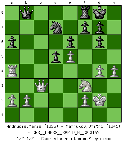 Last move : 1/2-1/2 2011 January 30 14:47:11 [Event "FICGS__CHESS__RAPID_B__000169"] [Site "FICGS"] [Date "2010.12.26"] [Round "1"] [White "Andrucis,Maris"] [Black "Mamrukov,Dmitri"] [Result "1/2-1/2"] [WhiteElo "1826"] [BlackElo "1841"] 1.e4 c6 2.Nf3 d5 3.e5 Bg4 4.d4 e6 5.Nbd2 c5 6.c3 cxd4 7.Qa4+ Nd7 8.Nxd4 a6 9.h3 Bh5 10.N2f3 Bc5 11.Bd3 Ne7 12.Bg5 Qc7 13.O-O O-O 14.Rfe1 Rac8 15.Bxe7 Bxe7 16.Qc2 Kh8 17.Kh1 Bc5 18.g4 Bg6 19.Bxg6 hxg6 20.Rad1 b5 21.Kg2 Kg8 22.h4 b4 23.Re3 Bxd4 24.Rxd4 bxc3 25.Rxc3 Qb8 26.Ra4 Rxc3 27.Qxc3 1/2-1/2 Caro-Kann defense Kingside Castling by player White (move 13) Kingside Castling by player Black (move 13) This chess game ended in a draw. Follow this game move after move (download)Chess is not like life... it has rules ! (Mark Pasternak) Ein typischer, sehr verbreiteter Gedankenschädling ist der, daß der betreffende Amateur von der Annanhme ausgeht, daß jeder einzelne Zug etwas zu leisten habe. (Aaron Nimzowitsch) Solo el jugador con la iniciativa tiene el derecho a atacar. (Wilhelm Steinitz) Le système Elo représente seulement une moyenne. Il est simplement un indicateur de votre stabilité. (Anatoli Karpov) If you lose the game you should win the analysis! (Proverb)