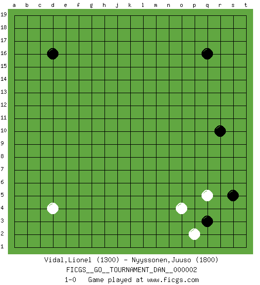 Last move : 1-0 2007 January 10 5:22:34 [Event "FICGS__GO__TOURNAMENT_DAN__000002"] [Site "FICGS"] [Date "2006.12.04"] [Round "1"] [Black "Vidal,Lionel"] [White "Nyyssonen,Juuso"] [Result "1-0"] [Rating 1 "1300"] [Rating 2 "1800"] 1.q16 d4 2.q3 q5 3.d16 o4 4.r10 p2 5.s5 1-0 This go game has been lost on time (started : 2006.12.04 22:28:52) Here are the names of the openings (joseki) played in the four corners : Corner q4 : q3 q5 Komoku (Somok, Xiao~mu`) 3-4 Point. The komoku (3-4) point is the traditional corner enclosure move.. Ikken Takagakari (Hankan Nop'dakeolch'im, Yi Gaogua`jiao~, 1-Space High Approach). The 5-4 approach move has become more popular in modern times, as modern Go emphasizes speed and influence. Player Black won this Go (weiqi, baduk) game. Follow this game move after move (download)A basic: Don't push too hard. (Jansteen) He who laughs last probably does not get the joke. (Unknown)