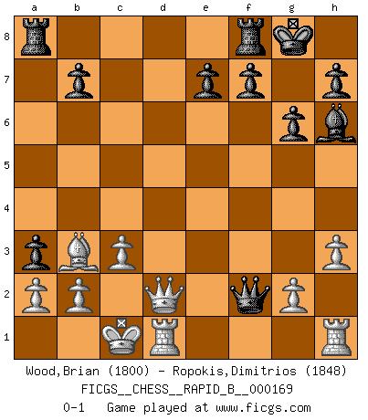 Last move : 0-1 2011 January 8 13:1:11 [Event "FICGS__CHESS__RAPID_B__000169"] [Site "FICGS"] [Date "2010.12.26"] [Round "1"] [White "Wood,Brian"] [Black "Ropokis,Dimitrios"] [Result "0-1"] [WhiteElo "1800"] [BlackElo "1848"] 1.e4 c6 2.d4 d5 3.Nc3 dxe4 4.Nxe4 Nd7 5.Qe2 Ndf6 6.Nxf6+ Nxf6 7.Nf3 Bg4 8.Be3 Nd5 9.O-O-O g6 10.h3 Nxe3 11.Qxe3 Bxf3 12.Qxf3 Bg7 13.Bc4 O-O 14.d5 cxd5 15.Qxd5 Qb6 16.Bb3 a5 17.c3 a4 18.Bc4 a3 19.Bb3 Qxf2 20.Qd2 Bh6 0-1 Caro-Kann : Steinitz variation Queenside Castling by player White (move 9) Kingside Castling by player Black (move 13) Player Black won this chess game. Follow this game move after move (download)Half the variations which are calculated in a tournament game turn out to be completely superfluous. Unfortunately, no one knows in advance which half. (Jan Tinman) Ein Schachgenie ist jemand der verdammt gut Schach spielt. (Jonathan Levitt) Ayuda a tus piezas para que ellas te puedan ayudar. (Paul Morphy) Pour moi, les échecs ne sont pas un jeu mais un art. (Alexandre Alekhine) Wisdom begins at the end. (Daniel Webster)