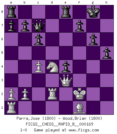 Last move : 1-0 2011 April 5 14:40:1 [Event "FICGS__CHESS__RAPID_B__000169"] [Site "FICGS"] [Date "2010.12.26"] [Round "1"] [White "Parra,Jose"] [Black "Wood,Brian"] [Result "1-0"] [WhiteElo "1800"] [BlackElo "1800"] 1.e4 d6 2.d4 Nf6 3.Bd3 g6 4.Nf3 Bg7 5.c4 O-O 6.O-O c6 7.h3 Nbd7 8.Be3 Re8 9.e5 dxe5 10.dxe5 Nh5 11.g4 Nxe5 12.Nxe5 Bxe5 13.Qb3 Nf6 14.Rd1 Qc7 15.Nd2 Bg3 16.Nf3 Bxf2+ 17.Bxf2 Bxg4 18.hxg4 Nxg4 19.Bf1 Nxf2 20.Kxf2 h5 21.Qe3 e5 22.Rd2 e4 23.Nd4 1-0 This chess game has been lost on time (started : 2010.12.26 0:40:21) King's pawn Opening Kingside Castling by player Black (move 5) Kingside Castling by player White (move 6) Player White won this chess game. Follow this game move after move (download)Not only will I predict his triumph over Botvinnik, but I'll go further and say that he'll probably be the greatest Chess player that ever lived. (John Collins) Wenn du nicht weißt was du tun sollst, warte bis dein Gegner eine Idee hat. Sie wird sicher schlecht sein. (Siegbert Tarrasch) El Ajedrez es un invernadero donde los frutos del carácter pueden madurar mas completamente que en la vida. (Edward Morgan Foster) Même si vous avez un bon coup à faire, regardez toujours s'il n'y en a pas un qui lui soit préférable. (Pedro Damiano) Panic is a sudden desertion of us, an a going over to the enemy of our imagination. (Christian Nevell Bovee)