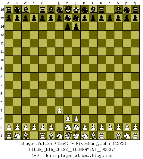 Last move : 1-0 2011 January 25 23:27:53 [Event "FICGS__BIG_CHESS__TOURNAMENT__000074"] [Site "FICGS"] [Date "2010.12.26"] [Round "1"] [White "Kehayov,Yulian"] [Black "Rivenburg,John"] [Result "1-0"] [WhiteElo "1554"] [BlackElo "1322"] 1.g2-g4 1-0 This big chess game has been lost on time (started : 2010.12.26 2:14:24) Follow this game move after move (download)Fischer prefers to enter Chess history alone. (Miguel Najdorf) Am wohlsten fühle ich mich, wenn ich sehe, wie sich mein Gegner im Todeskampf windet. (Robert James Fischer) Jugadores de primera clase pierden en contra de jugadores de segunda clase porque los jugadores de segunda clase a veces juegan una partida de primer clase. (Siegbert Tarrasch) Une platitude souvent récitée à propos des Echecs est qu'une des choses les plus difficiles à réaliser est de gagner une position gagnante. Cela ne manque pas de sens mais, pour ma part, j'ai toujours trouvé plus difficile de gagner une position perdante. (Tim Krabbe) Crush them ! Make them suffer ! (General Grievous in Star Wars ep.3)