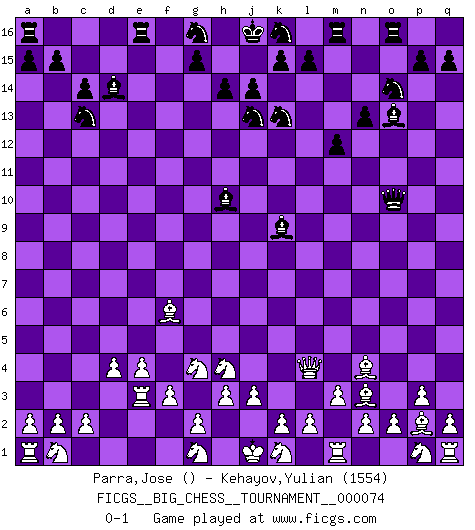 Last move : 0-1 2011 February 20 10:48:56 [Event "FICGS__BIG_CHESS__TOURNAMENT__000074"] [Site "FICGS"] [Date "2010.12.26"] [Round "1"] [White "Parra,Jose"] [Black "Kehayov,Yulian"] [Result "0-1"] [WhiteElo ""] [BlackElo "1554"] 1.m2-m3 j15-k13 2.j2-h4 h16-o10 3.l1-n3 m15-m13 4.h1-l4 d15-d13 5.p2-p3 e15-e13 6.o1-p2 e13-e12 7.e2-e4 n15-n13 8.d2-d4 f16-d14 9.c1-g5 o16-h10 10.f1-c4 l16-o13 11.g5-f6 m13-m12 12.c4-o15 p16-o14 13.e1-e3 q16-o16 14.o15-k11 c16-k9 15.k11-f15 e16-f16 16.f15-d13 b16-a14 17.h2-g4 c15-c14 18.d13-e12 f16-e16 19.f2-f3 a14-c13 20.e12-n4 h15-j13 0-1 This big chess game has been lost on time (started : 2010.12.26 2:14:24) Follow this game move after move (download)I like to say that Bobby Fischer was the greatest player ever. But what made Fischer a genius was his ability to blend an American freshness and pragmatism with Russian ideas about strategy. (Bruce Pandolfini) Obwohl ich vom Stil her kaum zu den Priestern der Schachkunst gezählt werde, halte ich Schach doch für eine Kunst. (Tigran Petrosjan) Nunca nadie ha ganado una partida de Ajedrez rindiendose. (Unknown) Le système Elo représente seulement une moyenne. Il est simplement un indicateur de votre stabilité. (Anatoli Karpov) When you've done things right people won't know you've done anything at all. (Futurama)