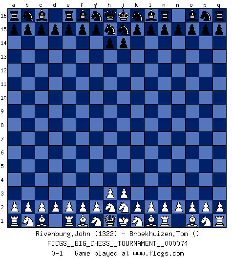 Last move : 0-1 2011 January 25 11:28:45 [Event "FICGS__BIG_CHESS__TOURNAMENT__000074"] [Site "FICGS"] [Date "2010.12.26"] [Round "1"] [White "Rivenburg,John"] [Black "Broekhuizen,Tom"] [Result "0-1"] [WhiteElo "1322"] [BlackElo ""] 0-1 This big chess game has been lost on time (started : 2010.12.26 2:14:24) Follow this game move after move (download)A big shock; the best chess player in history has passed away. (Lajos Portisch, about Bobby Fischer's death) Privat ist Kortschnoi kein schlechter Mensch, sehr sympathisch. Aber während des Spiels ist er grausam. Er will dich töten. (Miguel Najdorf) Una compensación adecuada por un sacrificio es tener una combinación sólida que conduce a una posición ganadora; una compensación adecuada por una metida de pata es dejar a tu oponente arrebatar una derrota de las fauces de la victoria. (Bruce A. Moon) J'ai toujours senti une vague pitié pour l'homme qui ne connaît rien aux échecs, tout comme j'en aurais pour un homme ignorant de l'amour. Les Echecs, comme la musique ou comme l'amour, ont le pouvoir de rendre heureux. (Siegbert Tarrasch) Live, lose, and learn, by observing your opponent how to win. (Amber Steenbock)