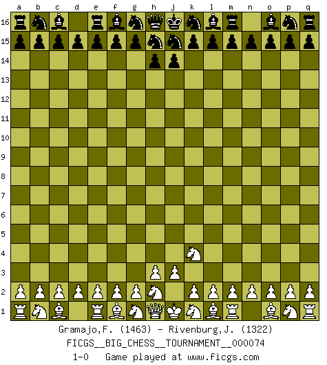 Last move : 1-0 2011 January 25 11:28:45 [Event "FICGS__BIG_CHESS__TOURNAMENT__000074"] [Site "FICGS"] [Date "2010.12.26"] [Round "1"] [White "Gramajo,Francisco"] [Black "Rivenburg,John"] [Result "1-0"] [WhiteElo "1463"] [BlackElo "1322"] 1.j2-k4 1-0 This big chess game has been lost on time (started : 2010.12.26 2:14:24) Follow this game move after move (download)Chess is thirty to forty percent psychology. You don't have this when you play a computer. I can't confuse it. (Judith Polgar) Ich verstehe Aljechins Kombinationen ganz gut; aber woher er diese Angriffschancen bekommt und wie er die Eröffnung behandelt das ist für mich ein Buch mit sieben Siegeln. (Rudolf Spielmann) Observen a Garry Kasparov. Después de una derrota, invariablemente el gana la próxima partida. Prácticamente hace pedazos a su siguiente oponente. Eso es algo que tenemos que aprender a lograr. (Maurice Ashley) Les échecs sont un jeu par leur forme, un art par leur essence et une science par sa difficulté d'acquisition. Ils peuvent vous procurer autant de plaisir qu'un bon livre ou une belle musique, mais vous n'aurez une réelle joie que si vous arrivez à bien jouer. (Tigran Petrosian) A married woman is like a fish riding a bicycle. (Rodolfo d'Ettorre)