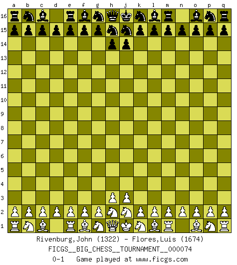 Last move : 0-1 2011 January 25 11:28:45 [Event "FICGS__BIG_CHESS__TOURNAMENT__000074"] [Site "FICGS"] [Date "2010.12.26"] [Round "1"] [White "Rivenburg,John"] [Black "Flores,Luis"] [Result "0-1"] [WhiteElo "1322"] [BlackElo "1674"] 0-1 This big chess game has been lost on time (started : 2010.12.26 2:14:24) Follow this game move after move (download)There's never before been a Chess player with such a thorough knowledge of the intricacies of the game and such an absolutely indomitable will to win. I think Bobby is the greatest player that ever lived. (Lisa Lane) Im Fernschach kannst du während dem Spiel rauchen. (John Christen Knudsen) El arma más poderosa en el Ajedrez, es tener la próxima movida. (David Bronstein) Il n'y a plus de joueurs du niveau de Jacob Murray dont la seule quête est le beau jeu, le plaisir de voir les pièces construire quelque chose. Sur 10 idées à la minute, 9 seront sans intérêt, la dernière s'avèrera géniale. (Christian Bauer) No man has ever achieved immortality in his own life time. (Unknown)