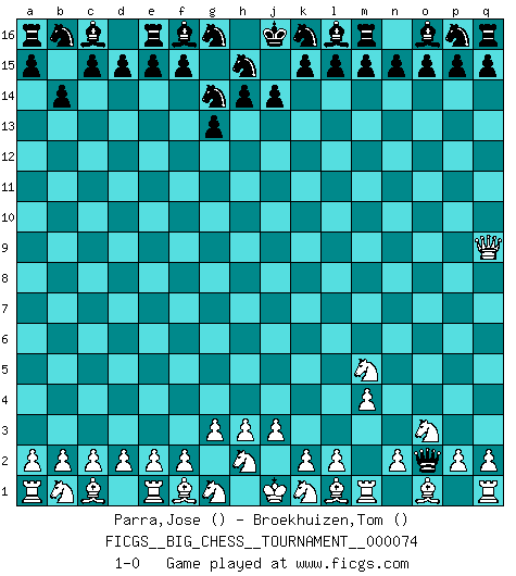 Last move : 1-0 2011 March 2 11:18:45 [Event "FICGS__BIG_CHESS__TOURNAMENT__000074"] [Site "FICGS"] [Date "2010.12.26"] [Round "1"] [White "Parra,Jose"] [Black "Broekhuizen,Tom"] [Result "1-0"] [WhiteElo ""] [BlackElo ""] 1.m2-m4 g15-g13 2.j2-k4 j15-g14 3.h1-q9 h16-o10 4.g2-g3 o10-o2 5.p1-o3 b15-b14 6.k4-m5 1-0 This big chess game has been lost on time (started : 2010.12.26 2:14:24) Follow this game move after move (download)In life, as in Chess, one's own Pawns block one's way. A man's very wealth, ease, leisure, children, books, which should help him to win, more often checkmate him. (Charles Buxton) Jeder weiß, dass Gasprom Putins persönliches Machtinstrument ist. Die Firma wird vom Kreml aus geleitet und wird schon deshalb nie transparent sein. (Garry Kasparov) El Ajedrez es un mar en el cual un mosquito puede beber y un elefante puede bañarse. (Refrán Hindú) Le jeu d'échecs fait naître et fortifie en nous plusieurs qualités précieuses dans le cours de l'existence, telles que la prévoyance, la circonspection, la prudence, et la persévérance. (Benjamin Franklin - 1783, la morale des échecs) Perhaps chess is the wrong game for the times (The Chess Master and the Computer, by Garry Kasparov - 2010)