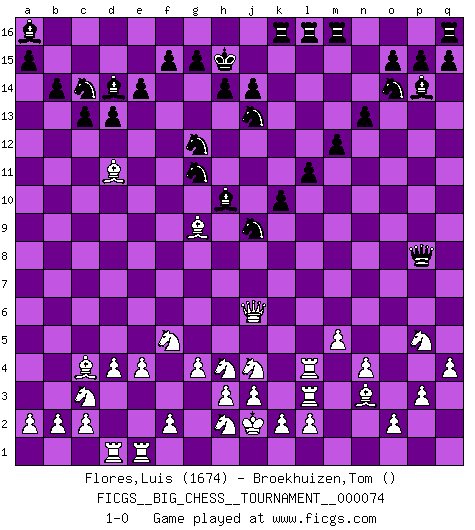 Last move : 1-0 2011 March 16 0:20:58 [Event "FICGS__BIG_CHESS__TOURNAMENT__000074"] [Site "FICGS"] [Date "2010.12.26"] [Round "1"] [White "Flores,Luis"] [Black "Broekhuizen,Tom"] [Result "1-0"] [WhiteElo "1674"] [BlackElo ""] 1.g2-g4 b15-b14 2.h1-c6 c15-c13 3.n2-n4 g16-f14 4.m2-m4 c16-b15 5.m4-m5 j15-g14 6.e2-e4 k16-l14 7.d2-d4 h16-l13 8.k1-l3 b16-c14 9.b1-c3 e15-e14 10.p1-o3 m15-m13 11.l1-n3 l16-o13 12.f1-b5 p16-o14 13.j2-h4 d15-d13 14.o1-f9 h15-j13 15.c1-j7 f16-d14 16.g1-f3 k15-k13 17.c6-c8 j16-h15 18.m1-m4 n15-n13 19.m4-l4 l13-f8 20.c8-c6 l14-j15 21.j1-j2 o16-h10 22.h4-f5 l15-l13 23.a1-d1 e16-l16 24.l3-j4 a16-k16 25.n3-m2 f8-p8 26.o3-p5 j15-h13 27.q2-q4 k13-k12 28.p2-p3 k12-k11 29.c6-j6 k11-k10 30.f3-h4 l13-l12 31.m2-n3 l12-l11 32.q1-m1 m13-m12 33.m1-m3 h13-g11 34.f9-g8 j13-k11 35.b5-c4 g14-j13 36.m3-l3 f14-g12 37.j7-g9 o13-p14 38.g8-a14 b15-a16 39.a14-g8 k11-j9 40.g8-d11 1-0 This big chess game has been lost on time (started : 2010.12.26 2:14:24) Follow this game move after move (download)Chess is a terrible game. If you have no center, your opponent has a freer position. If you do have a center, then you really have something to worry about ! (Siegbert Tarrasch) Pläne sind die Träume des Verständigen. (Ernst Freiherr von Feuchtersleben) Haz el enroque temprano y seguido. (Rob Sillars) Le joueur d'Echecs qui veut atteindre le top est obligé de développer son propre credo créatif. Alexeï Stepanovicth Souétine. Il est facile d'écrire des livres ! Ce qui est difficile, c'est de jouer ! (Alexeï Stepanovicth Souétine) Programming can only do so much before it becomes too much. (Don Groves)