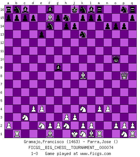 Last move : 1-0 2011 February 21 22:54:0 [Event "FICGS__BIG_CHESS__TOURNAMENT__000074"] [Site "FICGS"] [Date "2010.12.26"] [Round "1"] [White "Gramajo,Francisco"] [Black "Parra,Jose"] [Result "1-0"] [WhiteElo "1463"] [BlackElo ""] 1.j2-k4 e15-e13 2.d2-d4 n15-n14 3.e2-e4 e16-e14 4.n2-n4 j15-k13 5.o1-c12 e14-c14 6.c12-f15 c14-c2 7.b1-c3 o16-b4 8.h1-p8 p15-p14 9.g1-e2 g16-f14 10.m2-m4 h16-o10 11.c1-e3 c2-b2 12.a1-b1 b2-b1 13.e1-b1 b4-g9 14.e3-p13 o15-o14 15.p13-k8 1-0 This big chess game has been lost on time (started : 2010.12.26 2:14:24) Follow this game move after move (download)Bobby just drops the pieces and they fall on the right squares. (Miguel Najdorf) Frage: Gibt es etwas was Sie mehr lieben als Autobahnen ohne Tempobegrenzungen? - Antwort: Deutsche Frauen ohne Tempobegrenzungen. (Loek van Wely) Uno por uno, yo los acribillé, mi superioridad muy pronto se volvio aparente. (Jose Capablanca) Les Echecs mettent en conflit, non pas deux intelligences, mais deux volontés. (Lasker) The problem with troubleshooting is that trouble shoots back. (Anonymous)