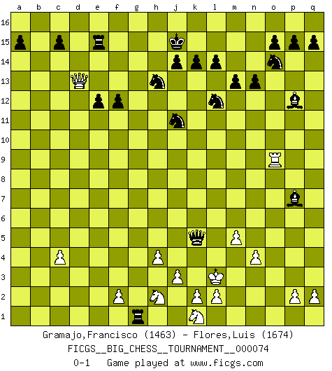 Last move : 0-1 2011 January 13 2:49:52 [Event "FICGS__BIG_CHESS__TOURNAMENT__000074"] [Site "FICGS"] [Date "2010.12.26"] [Round "1"] [White "Gramajo,Francisco"] [Black "Flores,Luis"] [Result "0-1"] [WhiteElo "1463"] [BlackElo "1674"] 1.j2-k4 g15-g13 2.n2-n4 h16-d12 3.e2-e4 m15-m13 4.f1-b5 n15-n13 5.m2-m4 o16-g9 6.l1-n3 d15-d13 7.b1-c3 e15-e13 8.d2-d4 k16-l14 9.o1-f9 p16-o14 10.c1-h6 f16-c13 11.h1-l4 l16-p12 12.e1-e3 c16-l8 13.c3-d5 b16-c14 14.e3-c3 g9-h8 15.m4-m5 h8-n3 16.o2-n3 d12-n3 17.p1-o3 c13-b14 18.m1-m3 n3-h8 19.h6-e9 h15-j13 20.e9-j13 l14-j13 21.o3-n5 h8-d4 22.q1-o1 d4-e4 23.b5-c6 e4-g2 24.o1-o8 g2-g12 25.a1-e1 l15-l14 26.n5-l6 l8-h11 27.m3-o3 h11-f9 28.c6-f9 e16-e14 29.c3-g3 g12-b7 30.c2-c4 b7-b2 31.o8-f8 f15-f13 32.o3-o8 b2-a2 33.k4-j6 e13-e12 34.l6-k8 a2-a5 35.f8-e8 j15-k13 36.k8-j10 g16-f14 37.j6-k8 f13-f12 38.j10-l11 j13-l12 39.l11-j12 j16-j15 40.f9-h11 e14-e15 41.k8-j10 b14-k6 42.h3-h4 k6-n9 43.o8-o9 n9-j13 44.l4-l10 k15-k14 45.j12-g13 h14-g13 46.j10-k12 j13-k12 47.g3-g13 a5-h12 48.e8-g8 h12-h11 49.e1-e8 f14-h13 50.g8-h8 h11-l11 51.l10-b10 k13-j11 52.b10-b15 a16-g16 53.e8-g8 g16-g13 54.b15-c14 m16-g16 55.d5-f6 g13-g8 56.h8-g8 l11-f6 57.g8-g16 q16-g16 58.c14-d13 g16-g1 59.j1-j2 f6-f5 60.j2-k3 f5-k5 61.k3-l3 k12-p7 0-1 Follow this game move after move (download)We must make sure that Chess will not be like a dead language, very interesting, but for a very small group. (Sytze Faber) Der 70jährige Viktor Kortschnoi: Die Rentenanstalt wollte mich zwingen in Rente zu gehen. Meine Frau erhält jetzt eine Pension- und ich zahle weiter in die Rentenkasse ein! (Viktor Kortschnoi) No es suficiente ser un buen jugador, se debe también de jugar bién. (Siegbert Tarrasch) Les écrivains ont utilisé les échecs pour analyser les côtés extrêmes de la nature humaine. Dans ce cadre, les échecs offrent un champ d'expérimentation idéal. Mais on pourrait faire la même chose avec la peinture. Et là, en vous référant à Van Gogh, vous ne tirerez pas de conclusion définitive sur les peintres. (Gary Kasparov) Shallow men believe in luck. Strong men belive in cause and effect. (Ralph Waldo Emerson)