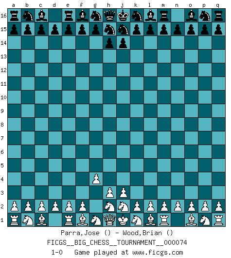 Last move : 1-0 2011 January 23 18:29:7 [Event "FICGS__BIG_CHESS__TOURNAMENT__000074"] [Site "FICGS"] [Date "2010.12.26"] [Round "1"] [White "Parra,Jose"] [Black "Wood,Brian"] [Result "1-0"] [WhiteElo ""] [BlackElo ""] 1.g2-g4 1-0 Follow this game move after move (download)Bobby Fischer's current state of mind is indeed a tragedy. One of the world's greatest Chess players - the pride and sorrow of American Chess. (Frank Brady) Je älter ich werde, um so mehr schätze ich die Bauern. (Paul Keres) El poder defensivo de una pieza clavada, solamente es imaginario. (Aaron Nimzovich) Les ravages du H expliquent la différence de niveau entre Tal et Thal [Abergel]. Art disturbs, science reassures. (Georges Braque, Le Jour et la Nuit)
