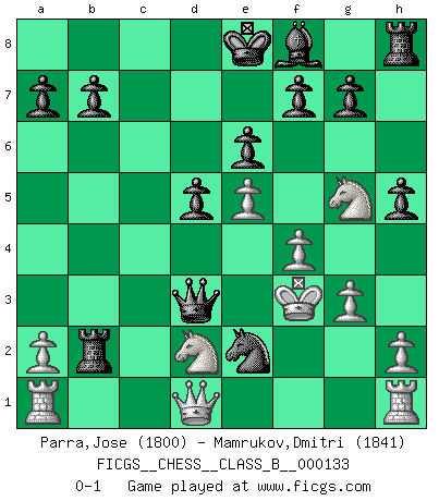 Last move : 0-1 2011 February 13 7:13:40 [Event "FICGS__CHESS__CLASS_B__000133"] [Site "FICGS"] [Date "2010.12.26"] [Round "1"] [White "Parra,Jose"] [Black "Mamrukov,Dmitri"] [Result "0-1"] [WhiteElo "1800"] [BlackElo "1841"] 1.e4 c6 2.d4 d5 3.e5 Bf5 4.Bd3 Bxd3 5.Qxd3 e6 6.f4 Ne7 7.Nf3 Qa5+ 8.c3 Qa6 9.Qc2 h5 10.Ng5 Nf5 11.Kf2 c5 12.Be3 Nc6 13.Nd2 cxd4 14.cxd4 Ncxd4 15.Bxd4 Nxd4 16.Qd1 Rc8 17.Nb3 Rc2+ 18.Kg3 Ne2+ 19.Kf3 Qc4 20.g3 Rxb2 21.Nd2 Qd3+ 0-1 Comment by player 1 : Jose Parra : never play Cd2.rrrrrrrrrrrr?????????? Caro-Kann : Advance variation Player Black won this chess game. Follow this game move after move (download)One doesn't have to play well, it's enough to play better than your opponent. (Siegbert Tarrasch) Ein Gewinn durch eine ungenaue Kombination, sei sie auch noch so vorzeigbar, erfüllt mich mit Schaudern. (Wilhelm Steinitz) Evita las multitudes. Haz independientemente tu propio razonamiento. Trata de ser el jugador de Ajedrez, no la pieza de Ajedrez. (Ralph Charell) Celui qui prend des risques peut perdre, celui qui n'en prend pas perd toujours. (Xavier Tartacover) However beautiful the strategy, you should occasionally look at the results. (Winston Churchill)