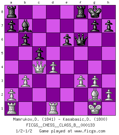 Last move : 1/2-1/2 2011 January 11 6:58:46 [Event "FICGS__CHESS__CLASS_B__000133"] [Site "FICGS"] [Date "2010.12.26"] [Round "1"] [White "Mamrukov,Dmitri"] [Black "Kasabasic,Djordje"] [Result "1/2-1/2"] [WhiteElo "1841"] [BlackElo "1800"] 1.d4 Nf6 2.c4 e6 3.g3 d5 4.Nf3 Bb4+ 5.Bd2 Be7 6.Bg2 O-O 7.O-O c6 8.Qc2 b6 9.Bf4 Nbd7 10.Rd1 Bb7 11.b3 Ne4 12.Nc3 f5 13.Nxe4 fxe4 14.Ne5 Nxe5 15.Bxe5 Bf6 16.Bxf6 Qxf6 17.f3 exf3 18.exf3 dxc4 19.Qxc4 c5 1/2-1/2 Catalan Opening Kingside Castling by player Black (move 6) Kingside Castling by player White (move 7) This chess game ended in a draw. Follow this game move after move (download)It's just you and your opponent at the board and you're trying to prove something. (Bobby Fischer) Im Leben werden Partien nie so unstrittig gewonnen wie im Spiel (Emanuel Lasker) No es tiempo de jugar al Ajedrez cuando la casa esta en llamas. (Proverbio Italiano) L'ordinateur a tué l'originalité. Il n'y a plus guère d'aventures sur l'échiquier. (Jacob Murray) Philosophers use a language that is already deformed as though by shoes that are too tight. (Ludwig Wittgenstein)