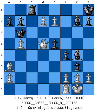 Last move : 1-0 2011 March 29 6:51:38 [Event "FICGS__CHESS__CLASS_B__000133"] [Site "FICGS"] [Date "2010.12.26"] [Round "1"] [White "Dusk,Jerzy"] [Black "Parra,Jose"] [Result "1-0"] [WhiteElo "1800"] [BlackElo "1800"] 1.d4 Nf6 2.c4 g6 3.Nc3 Bg7 4.e4 d6 5.Nf3 O-O 6.Be2 e5 7.O-O Nc6 8.d5 Ne7 9.b4 Ne8 10.c5 f5 11.Nd2 f4 12.Qb3 Nf6 13.Ba3 g5 14.cxd6 cxd6 15.Nc4 g4 16.Nxd6 Qxd6 17.b5 Qb6 18.d6 Kh8 19.dxe7 Re8 20.Nd5 Nxd5 21.exd5 Bf5 22.d6 Rac8 23.Rac1 Bd7 24.Rxc8 Rxc8 25.Qd5 g3 26.Bg4 Bxg4 27.d7 1-0 King's Indian : Orthodox, Aronin-Taimanov variation (Yugoslav attack / Mar del Plata variation) Kingside Castling by player Black (move 5) Kingside Castling by player White (move 7) Player White won this chess game. Follow this game move after move (download)We cannot resist the fascination of sacrifice, since a passion for sacrifices is part of a Chessplayer's nature. (Rudolf Spielman) Je mehr ich von der FIDE weiss, um so weniger verstehe ich. (Alexander Kalifman) Los finales de Peón son del Ajedrez lo que el cesped es del Golf. (Cecil Purdy) Toute estimation doit être constamment réévaluée. (Jacob Estrin) Without enthusiasm, virtue functions not at all, and vice only poorly. (Mignon McLaughlin, The Neurotic's Notebook, 1960)