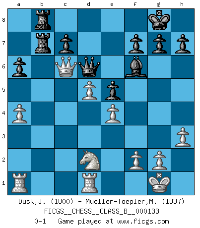 Last move : 0-1 2011 August 19 9:45:42 [Event "FICGS__CHESS__CLASS_B__000133"] [Site "FICGS"] [Date "2010.12.26"] [Round "1"] [White "Dusk,Jerzy"] [Black "Mueller-Toepler,Michael"] [Result "0-1"] [WhiteElo "1800"] [BlackElo "1837"] 1.e4 e5 2.Nf3 Nc6 3.Bb5 a6 4.Ba4 Nf6 5.O-O b5 6.Bb3 Bb7 7.d3 Be7 8.Nc3 d6 9.Nd5 Nxd5 10.Bxd5 O-O 11.Be3 Qd7 12.Qd2 Bf6 13.c3 Nd8 14.Bxb7 Nxb7 15.d4 Qe7 16.d5 Nc5 17.Bxc5 dxc5 18.c4 Qd6 19.Rfd1 Rfb8 20.a4 bxc4 21.Qc2 Qb6 22.Qxc4 Qxb2 23.Qxc5 Rb7 24.h3 Qb4 25.Qc6 Rab8 26.Nd2 Qd6 0-1 This chess game has been lost on time (started : 2010.12.26 11:22:29) Ruy Lopez : Archangelsk (counterthrust) variation Kingside Castling by player White (move 5) Kingside Castling by player Black (move 10) Player Black won this chess game. Follow this game move after move (download)In Chess, as it is played by masters, chance is practically eliminated. (Emanuel Lasker) Ich war zu klein für die Schach-Schülermannschaft! (Woody Allen) Haz el enroque temprano y seguido. (Rob Sillars) Vous savez, camarade Pachman, je n'éprouve pas de plaisir à être ministre, je jouerais plutôt aux échecs comme vous, ou alors ferais une révolution au Venezuela. (Che Guevara à Ludek Pachman, 'Checkmate in Prague', 1975) That's absurd. I love it. (Gregory House, House M.D.)