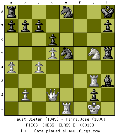 Last move : 1-0 2011 March 29 7:3:0 [Event "FICGS__CHESS__CLASS_B__000133"] [Site "FICGS"] [Date "2010.12.26"] [Round "1"] [White "Faust,Dieter"] [Black "Parra,Jose"] [Result "1-0"] [WhiteElo "1845"] [BlackElo "1800"] 1.d4 Nf6 2.c4 g6 3.Nc3 Bg7 4.e4 d6 5.Bd3 Nc6 6.Nge2 O-O 7.O-O e5 8.d5 Ne7 9.h3 Ne8 10.Ng3 f5 11.exf5 gxf5 12.Nh5 Ng6 13.Re1 Qe7 14.a4 f4 15.Ne4 Qh4 16.Ra3 f3 17.Nxg7 Kxg7 18.Bg5 Qh5 19.Bf1 Rf5 20.Qd2 fxg2 21.Be2 Rxg5 22.Bxh5 Rxh5 23.Rg3 Bxh3 24.f4 Kh8 25.fxe5 Nxe5 26.Ng5 1-0 King's Indian : 4.e4 Kingside Castling by player Black (move 6) Kingside Castling by player White (move 7) Player White won this chess game. Follow this game move after move (download)Of all my Russian books, the defense contains and diffuses the greatest 'warmth' which may seem odd seeing how supremely abstract Chess is supposed to be. (Vladimir Nabokov) Die westlichen Werte sind eine Sprache, welche die Putin-Administration nicht versteht. (Garry Kasparov) Yo jugué Ajedrez con el y a veces le pude haber ganado solo que siempre devuelve su última jugada y juega la partida de manera diferente. (Mark Twain) Mais n'est-ce pas déjà le limiter injurieusement que d'appeler les échecs un jeu? N'est-ce pas aussi une science, un art, ou quelque chose qui, comme le cercueil de Mahomet entre ciel et terre, est suspendu entre l'un et l'autre, et qui réunit un nombre incroyable de contraires ? (Stefan Zweig) Computers are like Old Testament gods; lots of rules and no mercy. (Joseph Campbell)