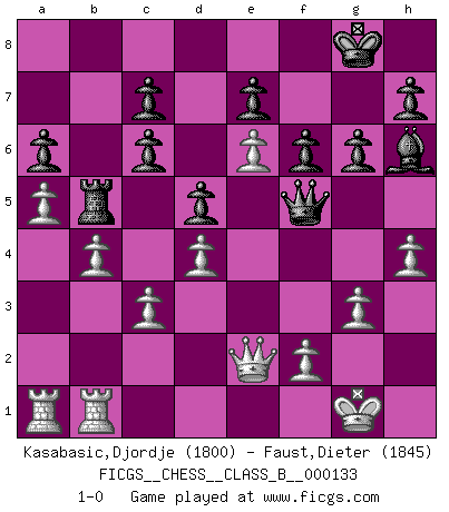 Last move : 1-0 2011 January 30 9:25:53 [Event "FICGS__CHESS__CLASS_B__000133"] [Site "FICGS"] [Date "2010.12.26"] [Round "1"] [White "Kasabasic,Djordje"] [Black "Faust,Dieter"] [Result "1-0"] [WhiteElo "1800"] [BlackElo "1845"] 1.e4 g6 2.d4 d5 3.e5 Bg7 4.Nc3 Nc6 5.Bb5 Nh6 6.Nf3 Bg4 7.h3 Bxf3 8.Qxf3 O-O 9.Bxh6 Bxh6 10.Bxc6 bxc6 11.Na4 f6 12.e6 Qb8 13.b3 Qb4+ 14.c3 Qa3 15.O-O Rab8 16.Nc5 Rb5 17.Nd7 Rd8 18.Rfb1 Qd6 19.a4 R5b8 20.Nxb8 Rxb8 21.Qd3 Rb6 22.a5 Rb5 23.Qe2 Qf4 24.b4 Qf5 25.h4 a6 26.g3 1-0 Robatsch (Modern) defense Kingside Castling by player Black (move 8) Kingside Castling by player White (move 15) Player White won this chess game. Follow this game move after move (download)Blessed be the memory of him who gave the world this immortal game. (A. G. Gardiner) Die FIDE ist dabei in die Hände der russischen Mafia zu fallen. (Larry Evans) No es tiempo de jugar al Ajedrez cuando la casa esta en llamas. (Proverbio Italiano) RxDa4 pat (...) Tomorrow's what you make of it. (Horatio Caine, C.S.I. Miami)