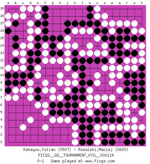 Last move : 0-1 2011 January 3 22:16:22 [Event "FICGS__GO__TOURNAMENT_KYU__000114"] [Site "FICGS"] [Date "2010.12.26"] [Round "1"] [Black "Kehayov,Yulian"] [White "Rozalski,Maciej"] [Result "0-1"] [Rating 1 "0507"] [Rating 2 "0600"] 1.r15 d4 2.q4 d17 3.f16 d15 4.d12 c13 5.d10 d7 6.e14 d14 7.d13 c12 8.d11 p16 9.n16 r17 10.q16 q17 11.p15 o17 12.o16 p17 13.r16 s16 14.s15 s17 15.e15 e16 16.g15 q8 17.q12 q10 18.o9 q6 19.o6 f3 20.g6 j4 21.l4 c3 22.j6 f8 23.g9 f9 24.f10 g8 25.h8 h7 26.j7 h9 27.g10 j8 28.k8 k9 29.l8 h10 30.h6 g7 31.l9 k10 32.j10 j11 33.h11 h12 34.k11 j12 35.l10 j9 36.g11 g12 37.l11 h14 38.k13 j13 39.g13 f13 40.g14 e10 41.f11 e11 42.e12 f12 43.e13 f14 44.f15 j15 45.h15 k14 46.j16 k16 47.k17 l16 48.j17 l13 49.k12 m14 50.h13 j14 51.e17 d16 52.f17 n13 53.m12 m13 54.l12 m16 55.n17 n18 56.m18 n19 57.m19 o18 58.l17 n15 59.m17 o14 60.o15 o13 61.q15 o11 62.o12 p12 63.n12 q11 64.p13 p11 65.q13 r12 66.r13 s12 67.s13 p9 68.p8 p7 69.o8 o7 70.p6 q5 71.p5 n7 72.n8 n6 73.n5 l6 74.k7 m5 75.n4 r4 76.o5 q3 77.p4 p3 78.o4 o3 79.m4 n3 80.l5 m6 81.k5 h4 82.j5 f6 83.g5 g4 84.h5 f5 85.k4 k3 86.l3 k2 87.l2 k1 88.l1 d9 89.e8 d8 90.e7 e6 91.m3 n2 92.m2 n1 93.m1 c11 94.c10 b11 95.c9 c8 96.b9 b8 97.a8 a7 98.a9 b7 99.b10 a11 100.a10 e18 101.d18 c18 102.f18 e19 103.f19 d19 104.b19 b18 105.t12 s11 106.t11 t10 107.s10 t13 108.t9 r11 109.t11 t12 110.s8 r7 111.s7 s6 112.t6 t5 113.s5 t7 114.t4 s4 115.t6 r6 116.t8 r5 117.s3 r3 118.r2 s2 119.q2 t3 120.s1 t5 121.r1 n10 122.o10 p10 123.t7 m8 124.m9 n9 125.l7 m7 126.p14 t14 127.t15 t16 128.r9 s14 129.t10 r14 130.s9 pass 131.r10 pass 132.r8 pass 133.q14 pass 134.t2 s3 135.t1 pass 136.k6 pass 137.p2 pass 138.o2 pass 139.o1 pass 140.p1 pass 141.a19 pass 142.a18 a17 143.b17 c19 144.a16 a18 145.b15 c14 146.b14 b13 147.b12 0-1 Here are the names of the openings (joseki) played in the four corners : Corner d16 : d17 f16 Komoku (Somok, Xiao~mu`) 3-4 Point. The komoku (3-4) point is the traditional corner enclosure move.. Corner q16 : r15 p16 Mokuhazushi (Waemok, Wai`mu`) 5-3 Point. The mokuhazushi (5-3) point was popular in the Edo period in Japan (1600 - 1867). It emphasizes influence; territorially, it is inferior to the 3-4 point. Takamoku Kakari. White prevents Black from gaining influence, but in the local context, abandoning profit in the corner entails a loss. Black 3-4 and 4-4 are best. Corner q4 : q4 q8 Hoshi (Hwajeom, Seongjeom, Xingwei`) 4-4 Point. The star or hoshi (4-4) point, emphasizing influence at the potential expense of territory. Player White won this Go (weiqi, baduk) game. Follow this game move after move (download)Don't disturb symmetry. (Anonymous) There are two kinds of tragedy in this world, one is not getting what you want and the other is getting. (Lord of war)