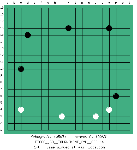 Last move : 1-0 2011 February 1 11:42:55 [Event "FICGS__GO__TOURNAMENT_KYU__000114"] [Site "FICGS"] [Date "2010.12.26"] [Round "1"] [Black "Kehayov,Yulian"] [White "Lazarov,Alexander"] [Result "1-0"] [Rating 1 "0507"] [Rating 2 "0063"] 1.d15 q4 2.q16 c4 3.k16 j3 4.r6 o3 5.c10 1-0 This go game has been lost on time (started : 2010.12.26 18:13:14) Here are the names of the openings (joseki) played in the four corners : Corner q4 : q4 r6 Hoshi (Hwajeom, Seongjeom, Xingwei`) 4-4 Point. The star or hoshi (4-4) point, emphasizing influence at the potential expense of territory. Ikken Kakari (Hankan Keolch'im, Yi Gua`jiao~, 1-Space Low Approach). Black 2 is the standard approach move to the 4-4. Player Black won this Go (weiqi, baduk) game. Follow this game move after move (download)Pon-nuki is worth thirty points. (Anonymous) Creativity involves breaking out of established patterns in order to look at things in a different way. (Edward De Bono)